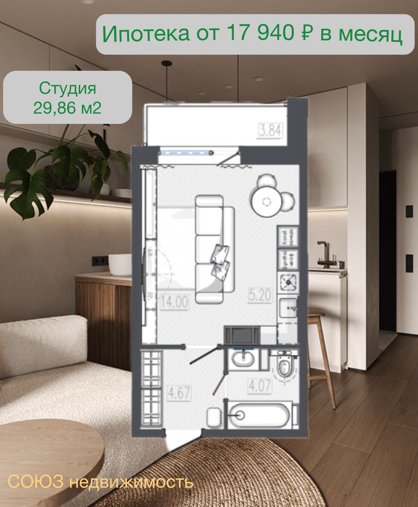 ✅ Лоджия - 3,84 м2;