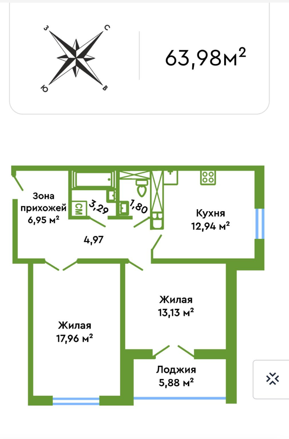 Общая площадь квартиры 61 кв. +лоджия 5,8 кв. с панорамным остеклением, две раздельные комнаты - 18 и 13 кв., кухня - 13 кв., санузел раздельный.