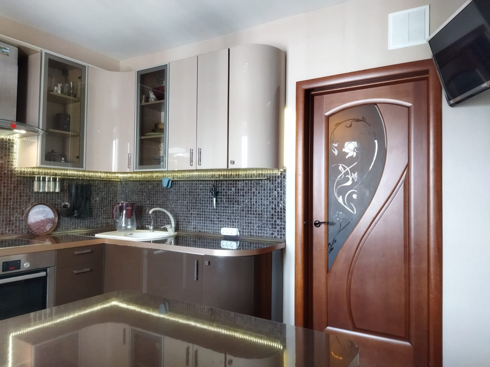 кухонный гарнитур ЗОВ с огромным количеством шкафов для хранения с фурнитурой Вlum, итальянские ручки, столешница и обеденный стол выполнены в едином стиле, встроенный холодильник Gоrеnjе, встроенная стиральная машина Воsсh, варочная панель и духовой шкаф Воsсh, вытяжка Sаmsung, фильтр обратного осмоса, фартук — битая мозаика, кухонный уголок из высокопрочной ткани с двумя вместительными отделениями.