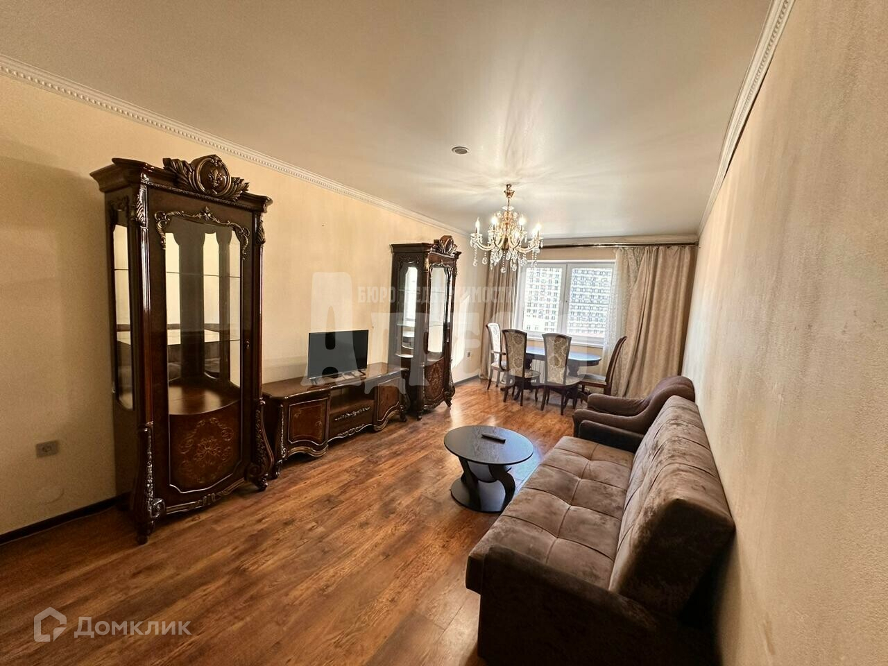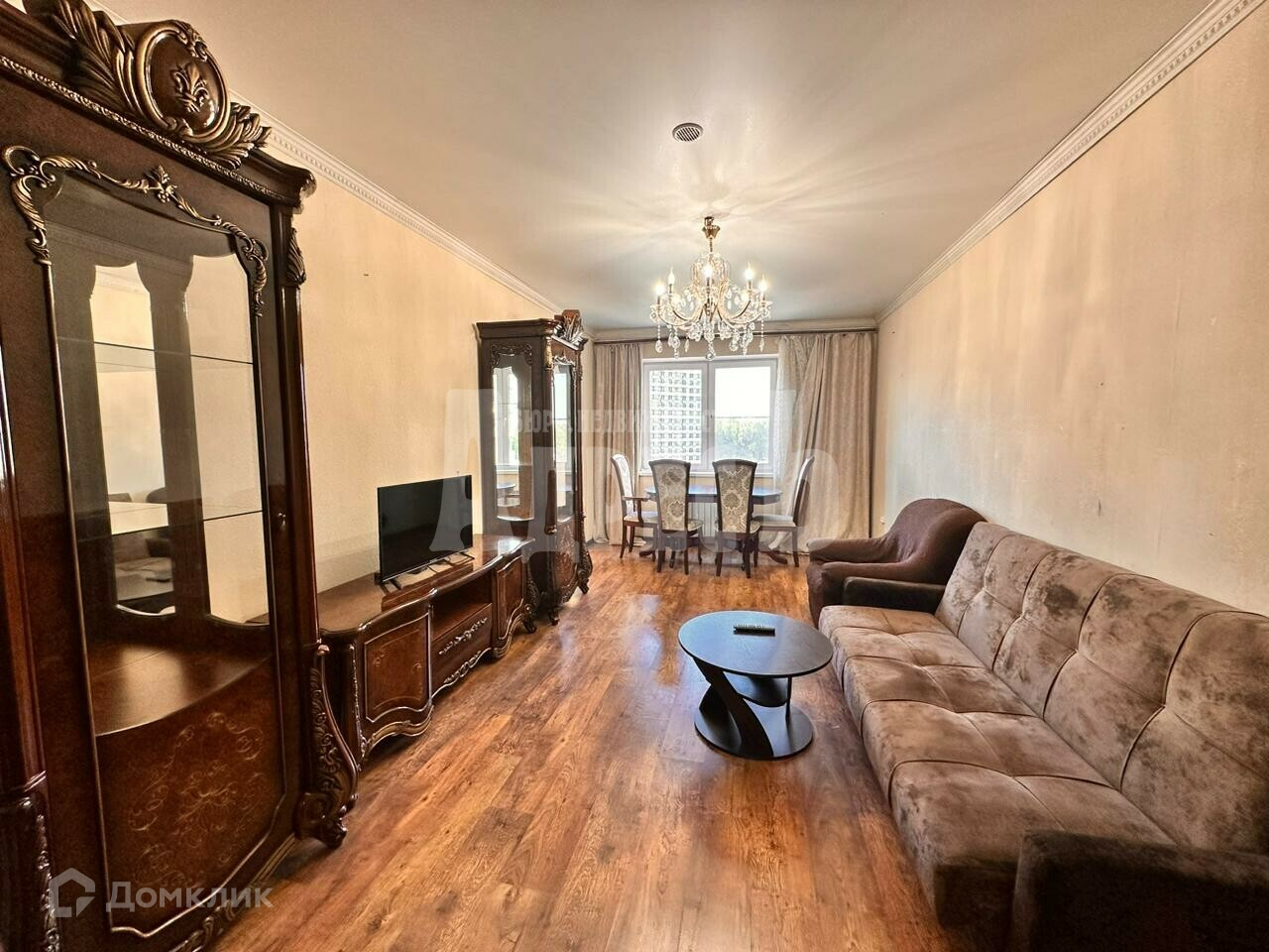 Остается встроенная кухня (варочная панель, духовой шкаф, вытяжка, холодильник), стиральная машина, диван в зале.