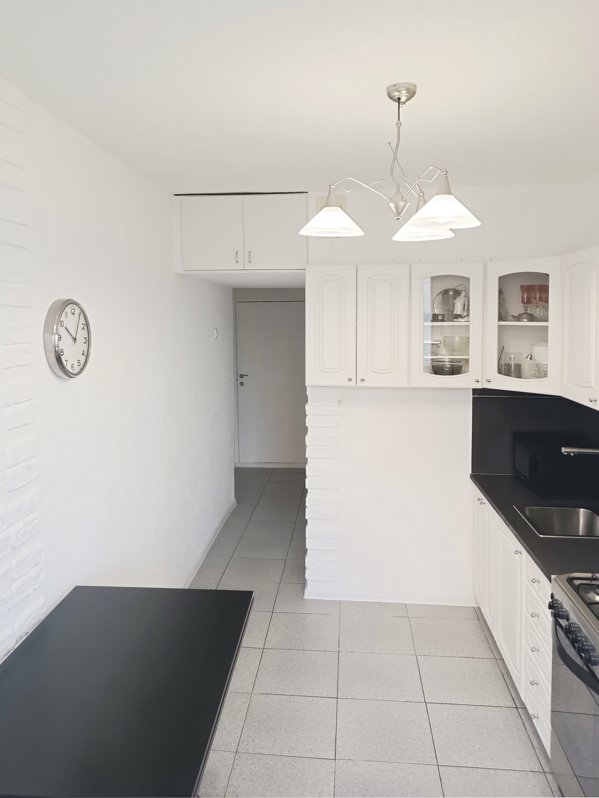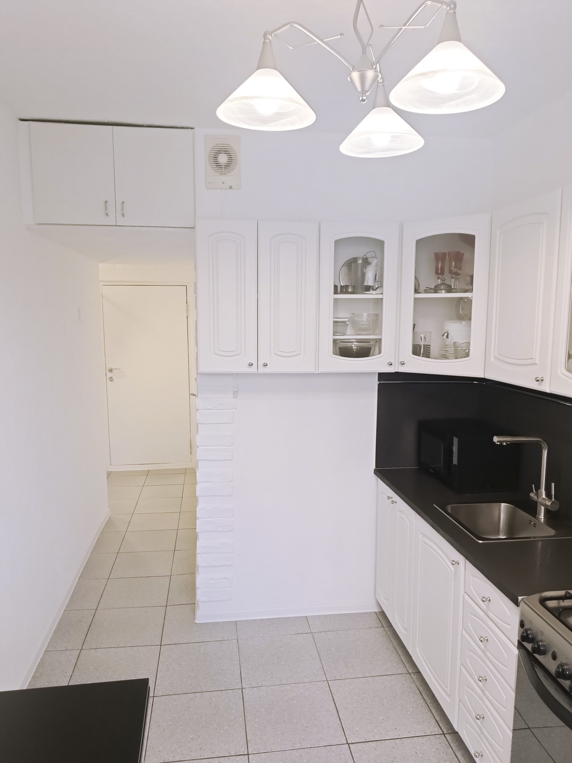 В комнате встроенная мебель (стенка, дуб). На кухне встроенная мебель, холодильник и газовая плита INDESIT с газконтролем конфорок и электроподжигом. В ванной комнате встроенная тумба. В квартире счетчики холодной и горячей воды, домофон, железная дверь.