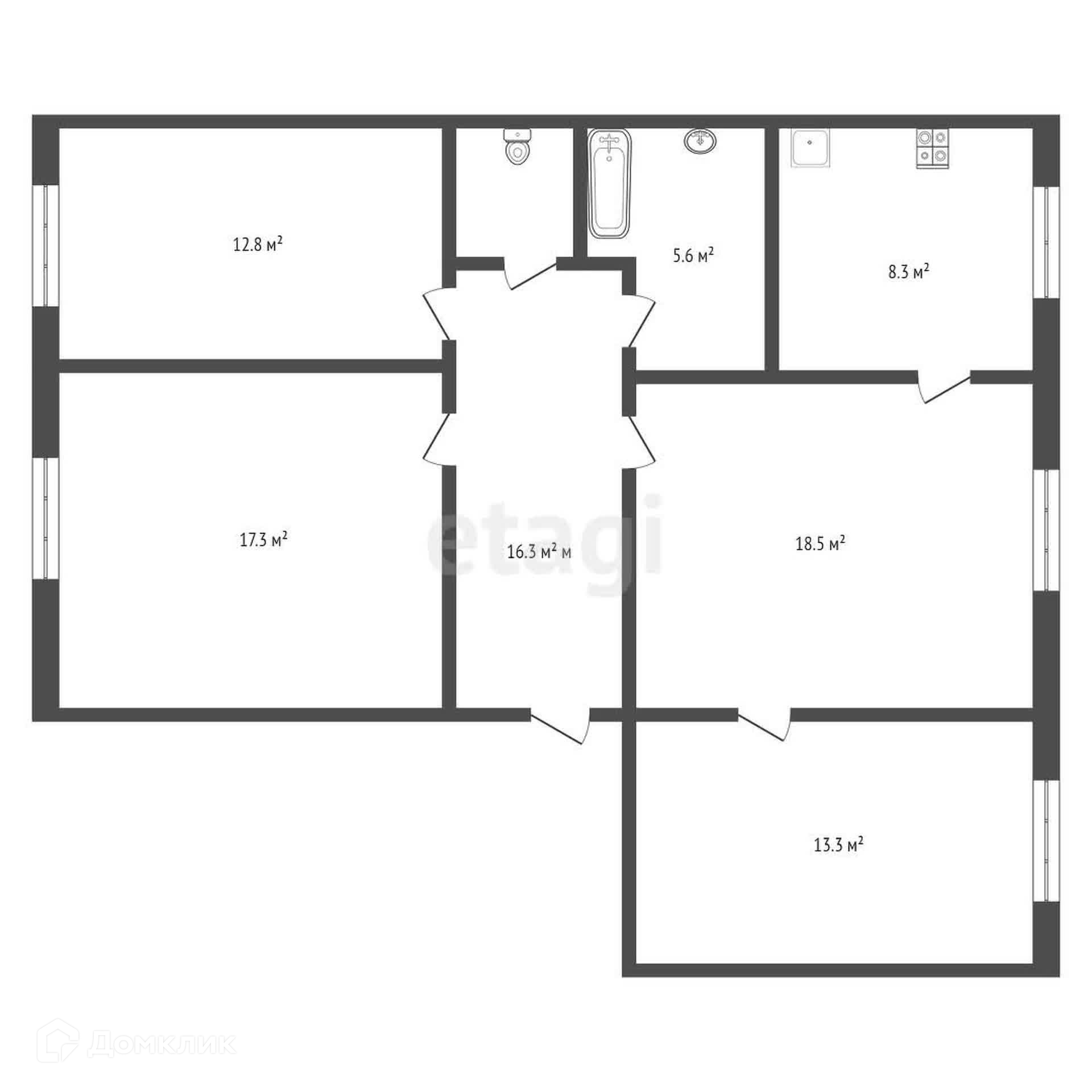 Общая площадь квартиры 90,4 кв.м. Кухня 8 кв.м. Просторные комнаты площадью 18,5 кв.м., 17,8 кв.м., 13,3 кв.м. и 12,8 кв.м. Окна выходят на разные стороны дома: две спальни во двор; кухня, гостиная и спальня - с видом на дорогу. Санузел раздельный. Высота потолков 3м. Дом кирпичный, толстые стены, высокий цоколь.