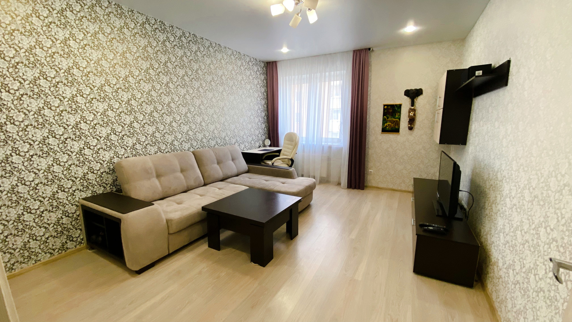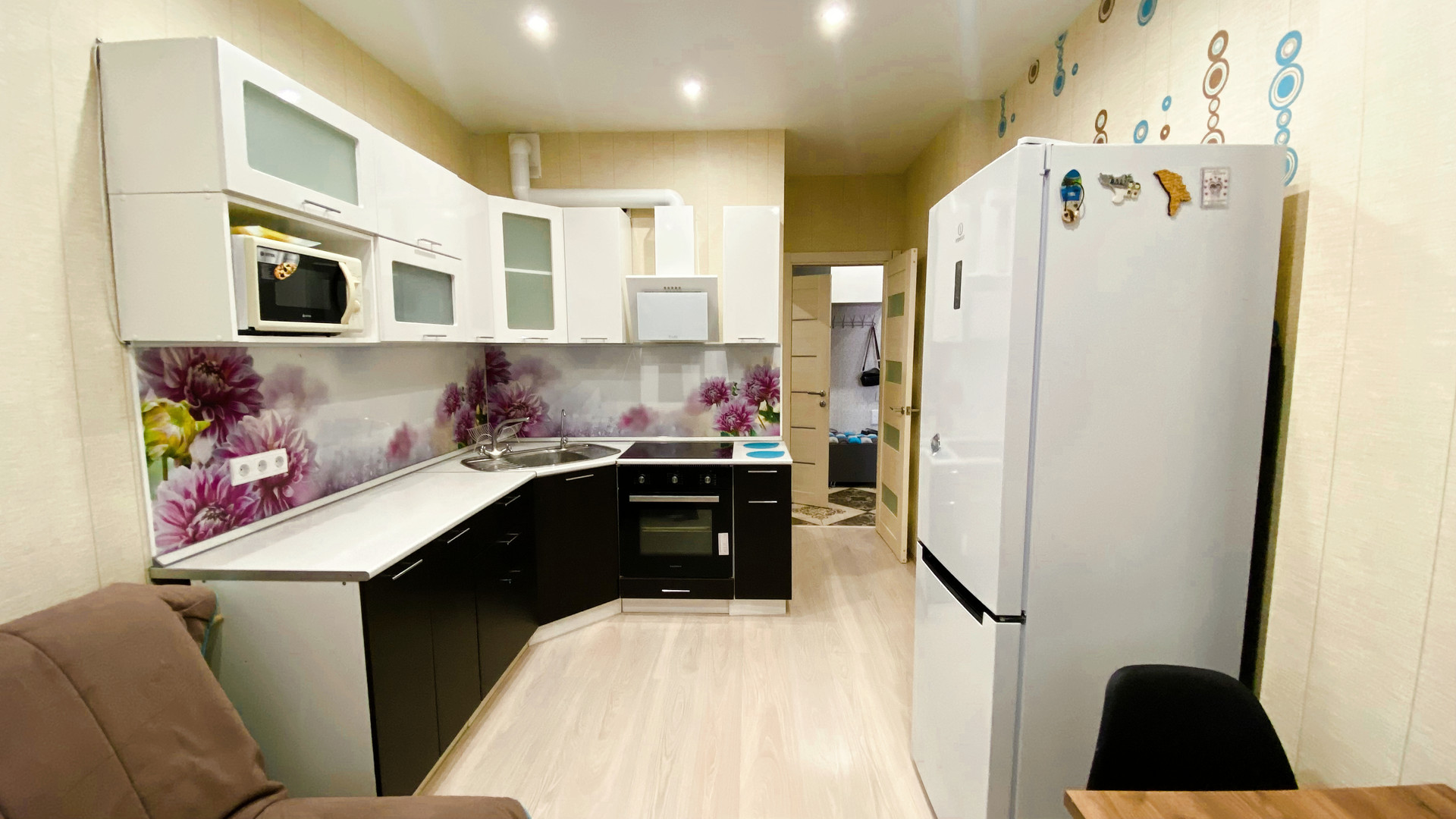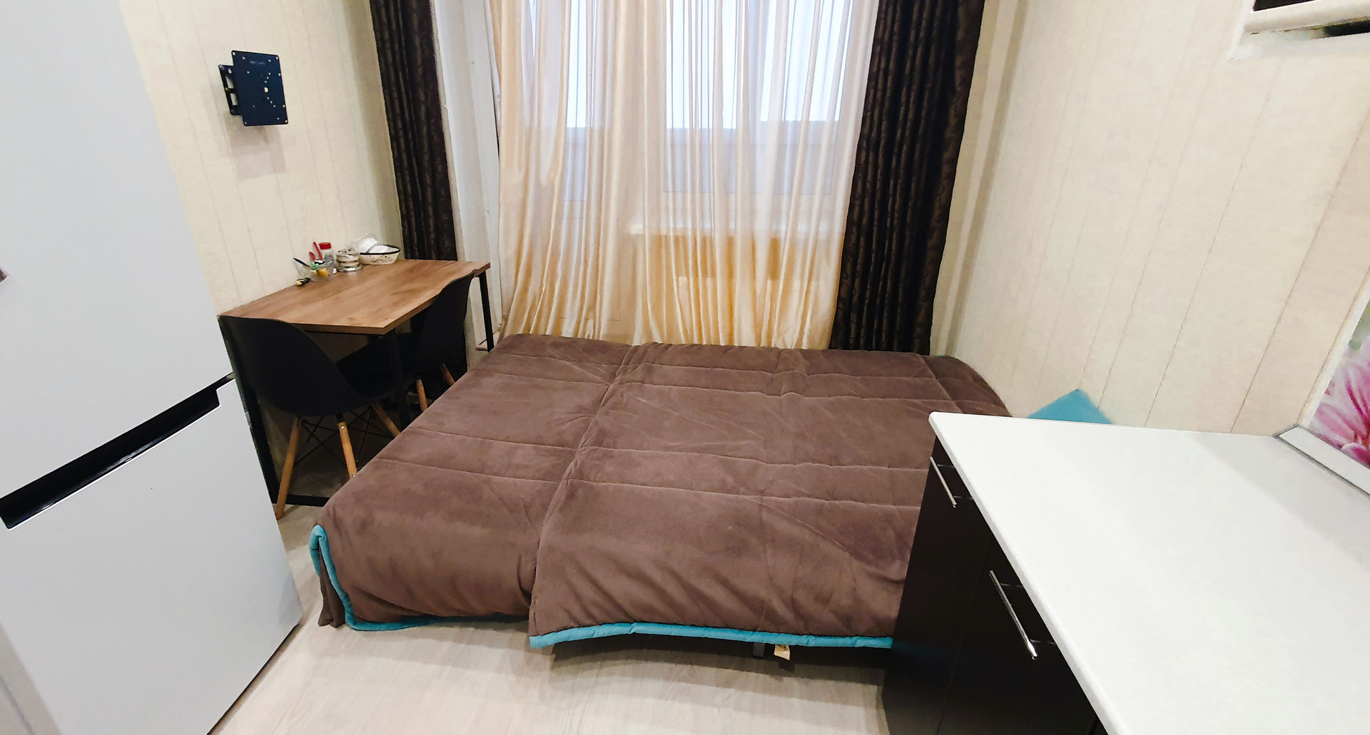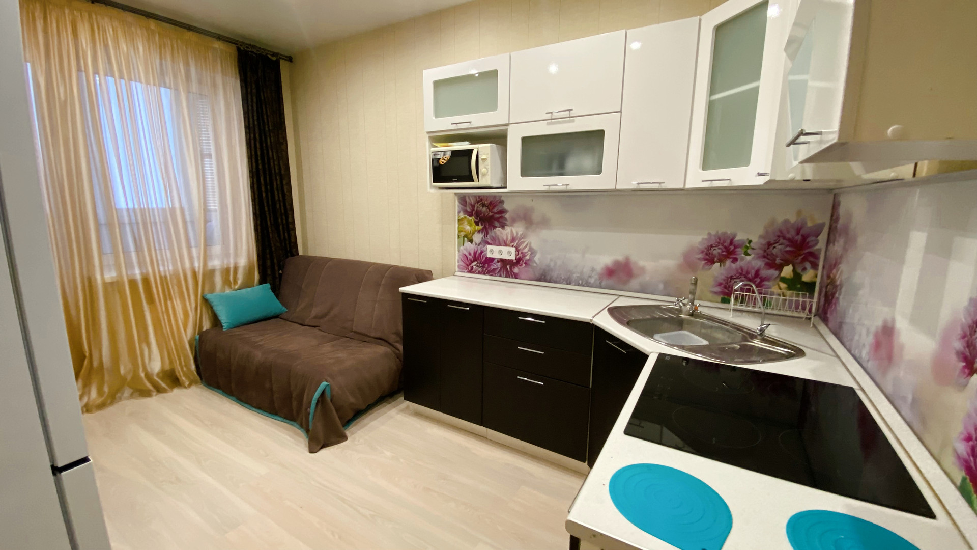 В КВАРТИРЕ ОСТАЁТСЯ ВСЁ, ЧТО ВИДИТЕ НА ФОТО (кухня со встроенной техникой- индукционная варочная панель, духовка, микроволновка, вытяжка, холодильник, стол, стулья, полноценный и очень удобный двухместный гостевой диван. В ванной -огромное зеркало и столешница, встроенный шкафчик с полками и корзиной для белья. Прихожая и огромная гардеробная, которая вместит всё что нужно и избавит от шкафов в комнате. В зале недавно купленный диван, а также столик, шкаф настенный и TV. В квартире установлен умный дом (включаются светильники в каждом помещении отдельно, работает вытяжка в ванной по графику, по приложению, по команде «Алиса…». Всё делалось для себя и в аренду не сдавалось. Большая 12-метровая кухня-гостиная и 5-метровый балкон. Комфортный для проживания 5 этаж