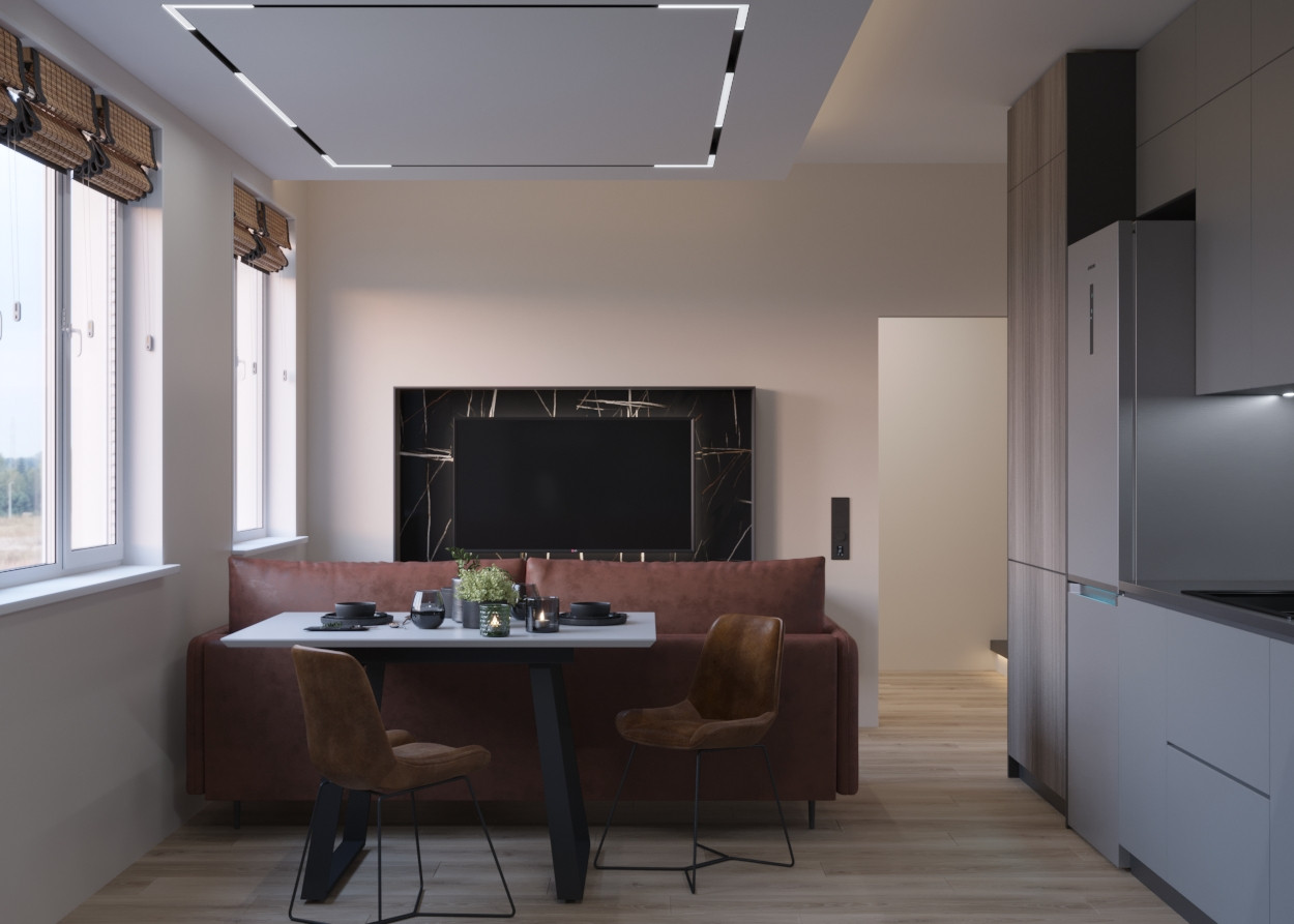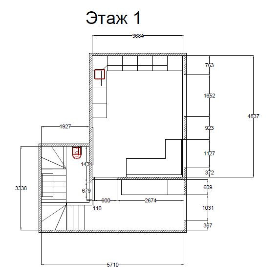 На первом этаже кухня-гостиная, санузел.