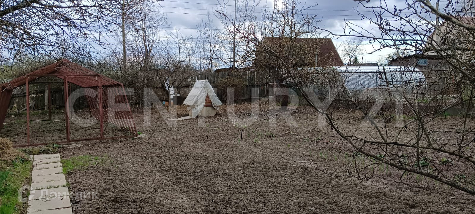 На участке плодоносящие деревья и кусты, металлический каркас парника.