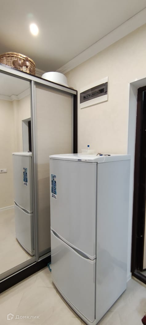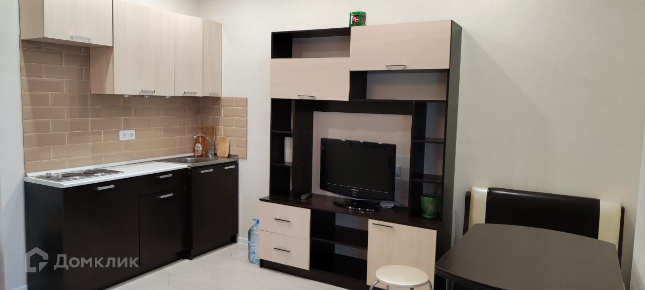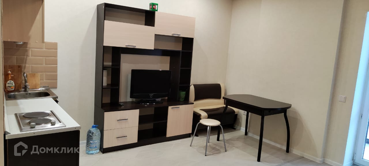 В студии есть кровать диван, телевизор, холодильник, посуда, стиральная машина.