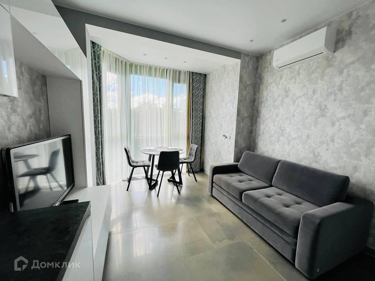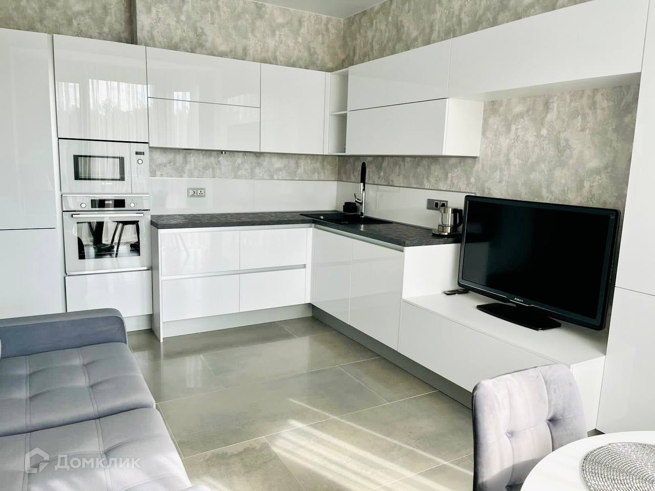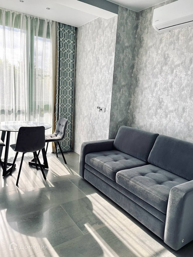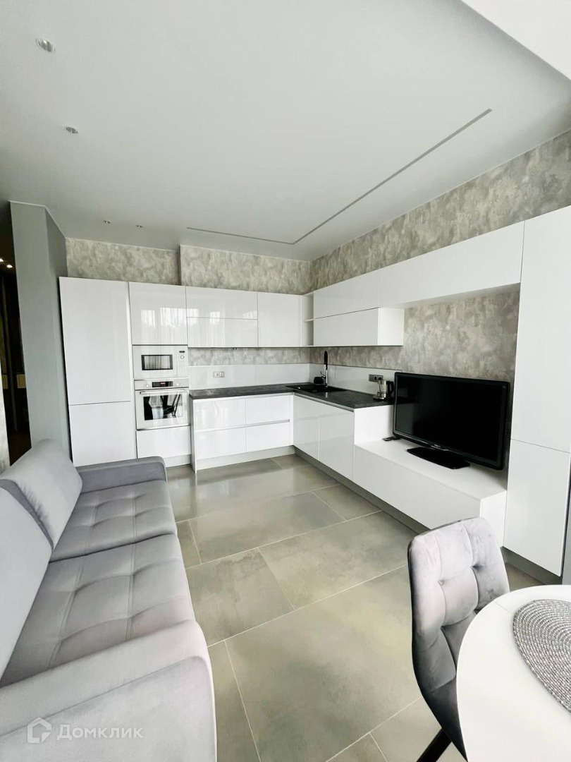Квартира представляет собой евро-двушку, где кухня объединена с гостиной. Кухня оснащена всем необходимым для комфортного проживания: индукционная плита, вместительный холодильник, духовой шкаф, микроволновая печь и даже кондиционер. В гостиной установлен телевизор и удобный диван.
