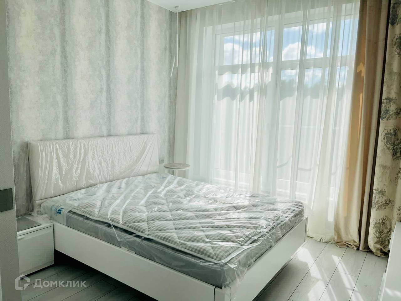 В спальне стоит большая двуспальная кровать.