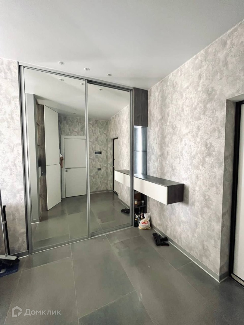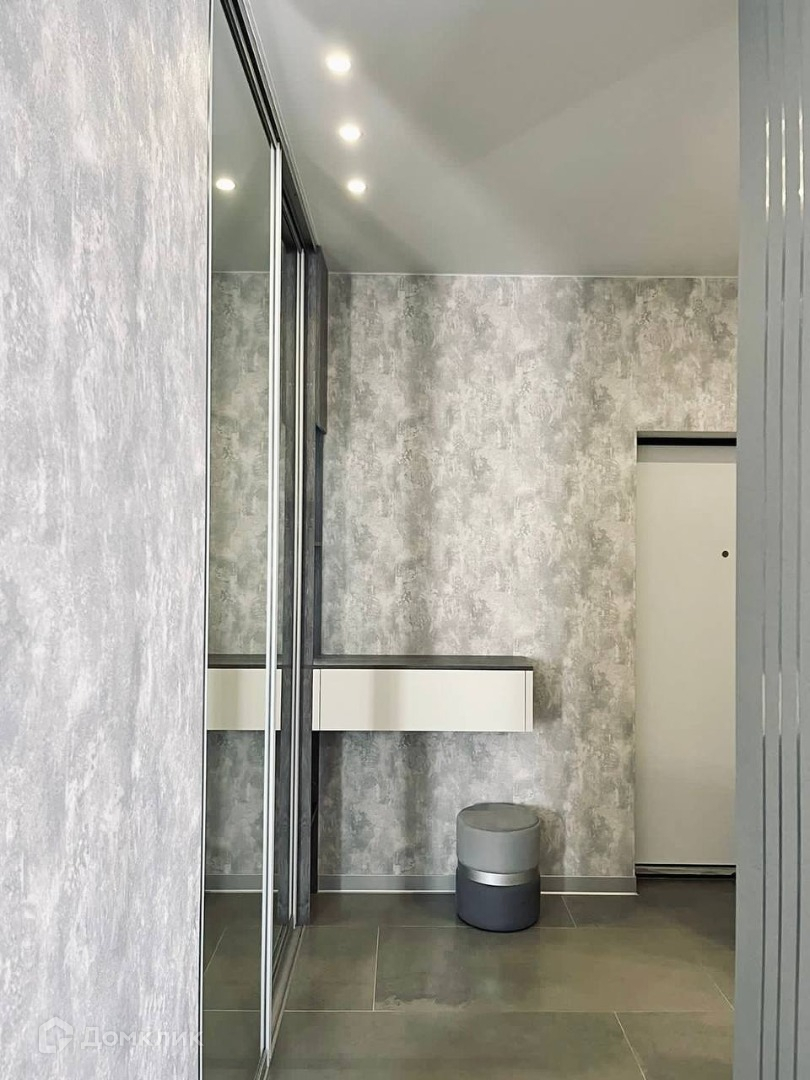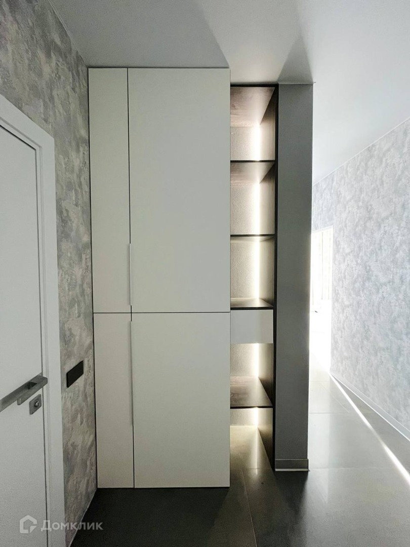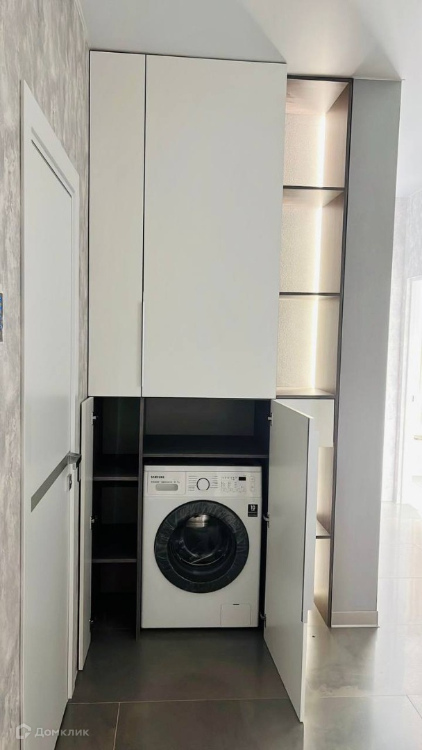 В коридоре стоит большой шкаф купе и спрятанная стиральная машина.