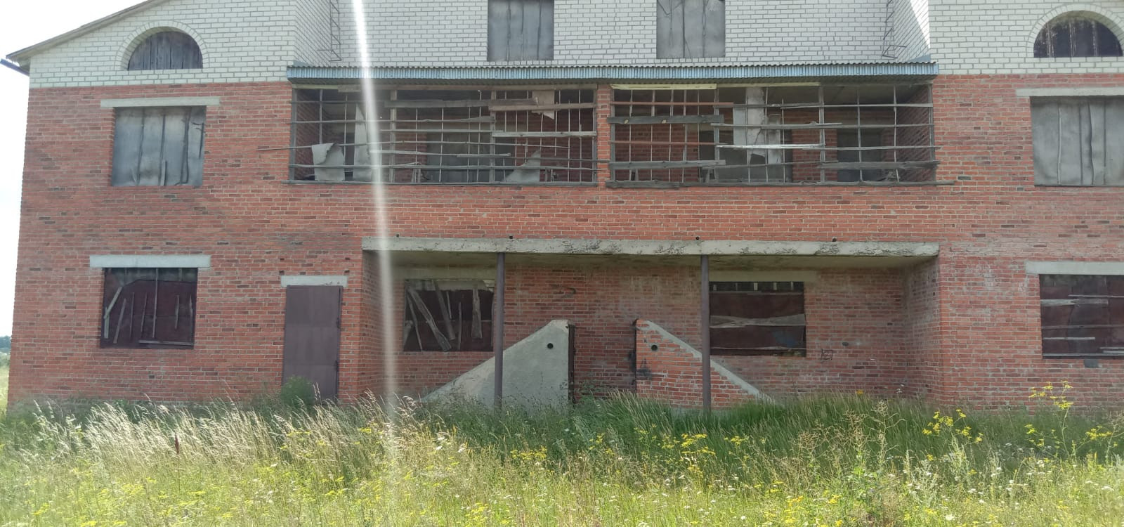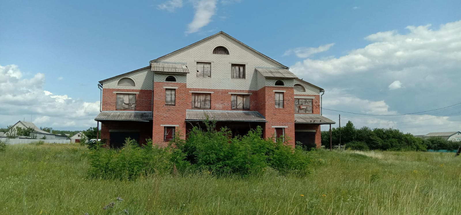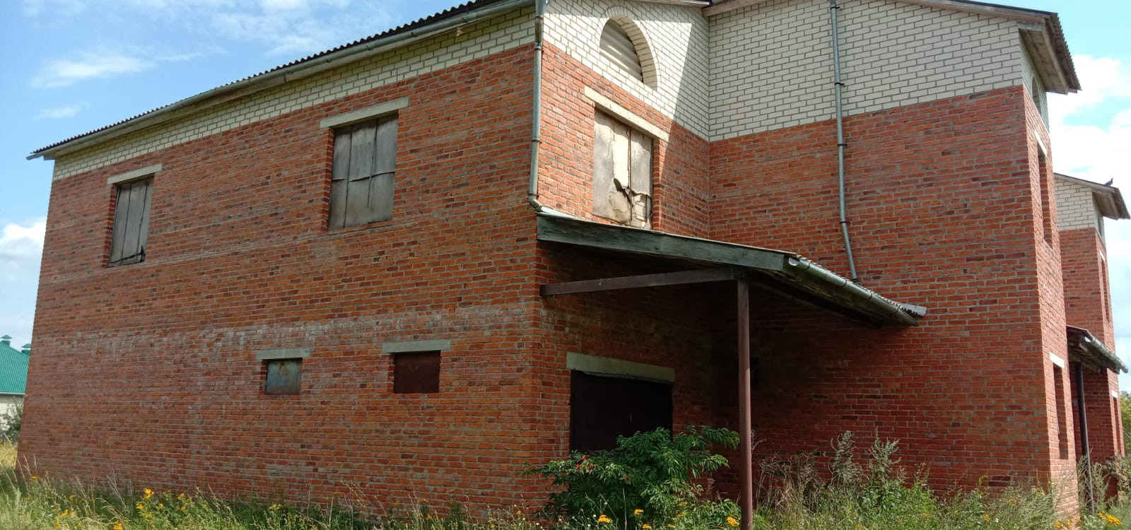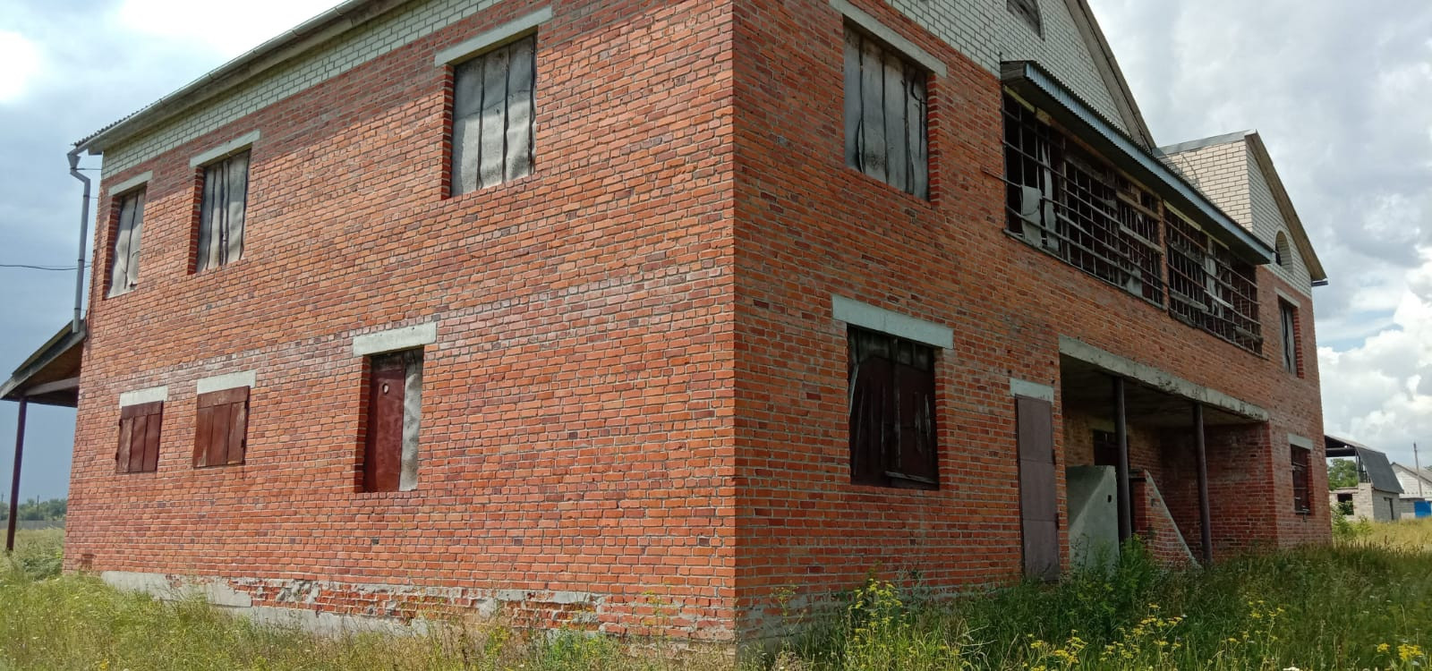 Возведена коробка: стены из красного кирпича и керамзитоблоков, железобетонные перекрытия, фундамент ленточный сборный, кровля - шифер.
