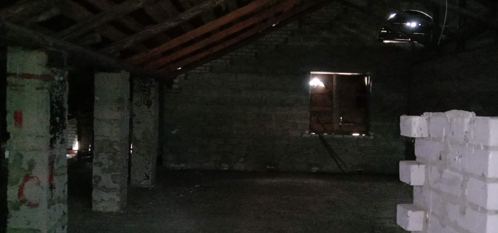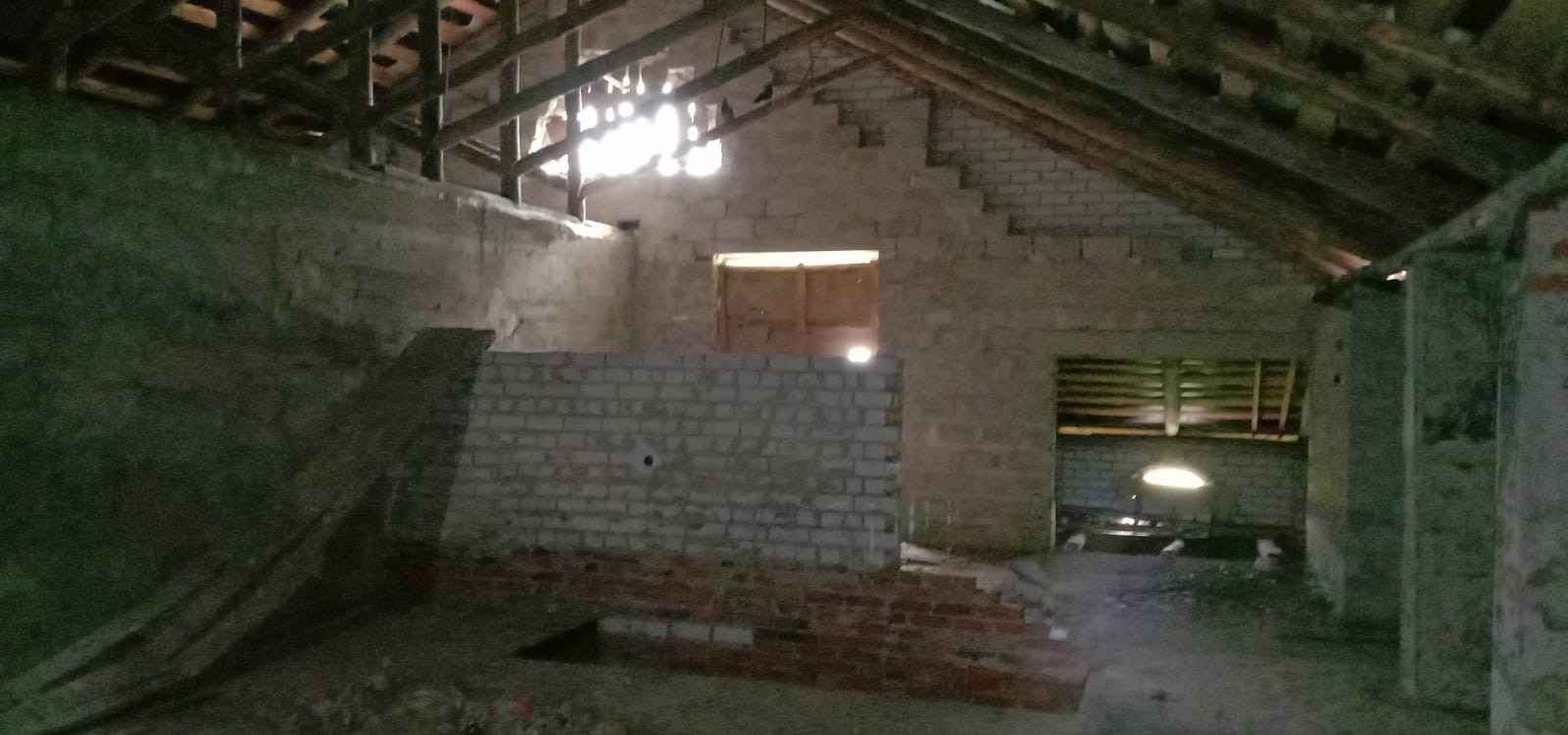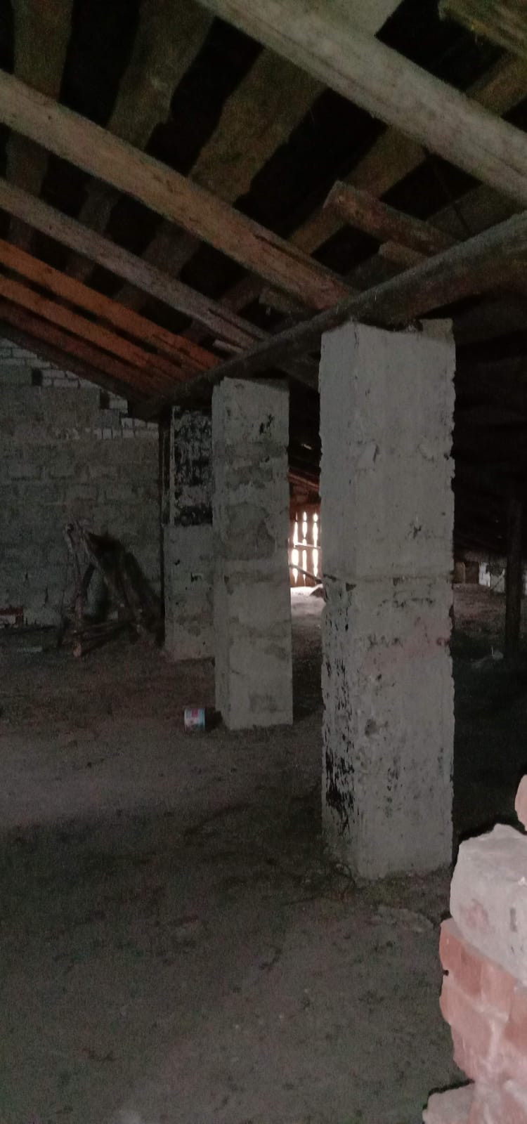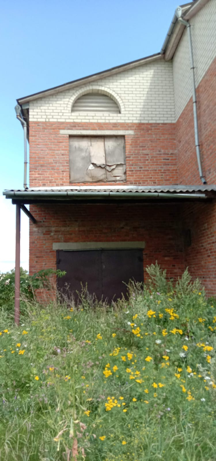 Возведена коробка: стены из красного кирпича и керамзитоблоков, железобетонные перекрытия, фундамент ленточный сборный, кровля - шифер.