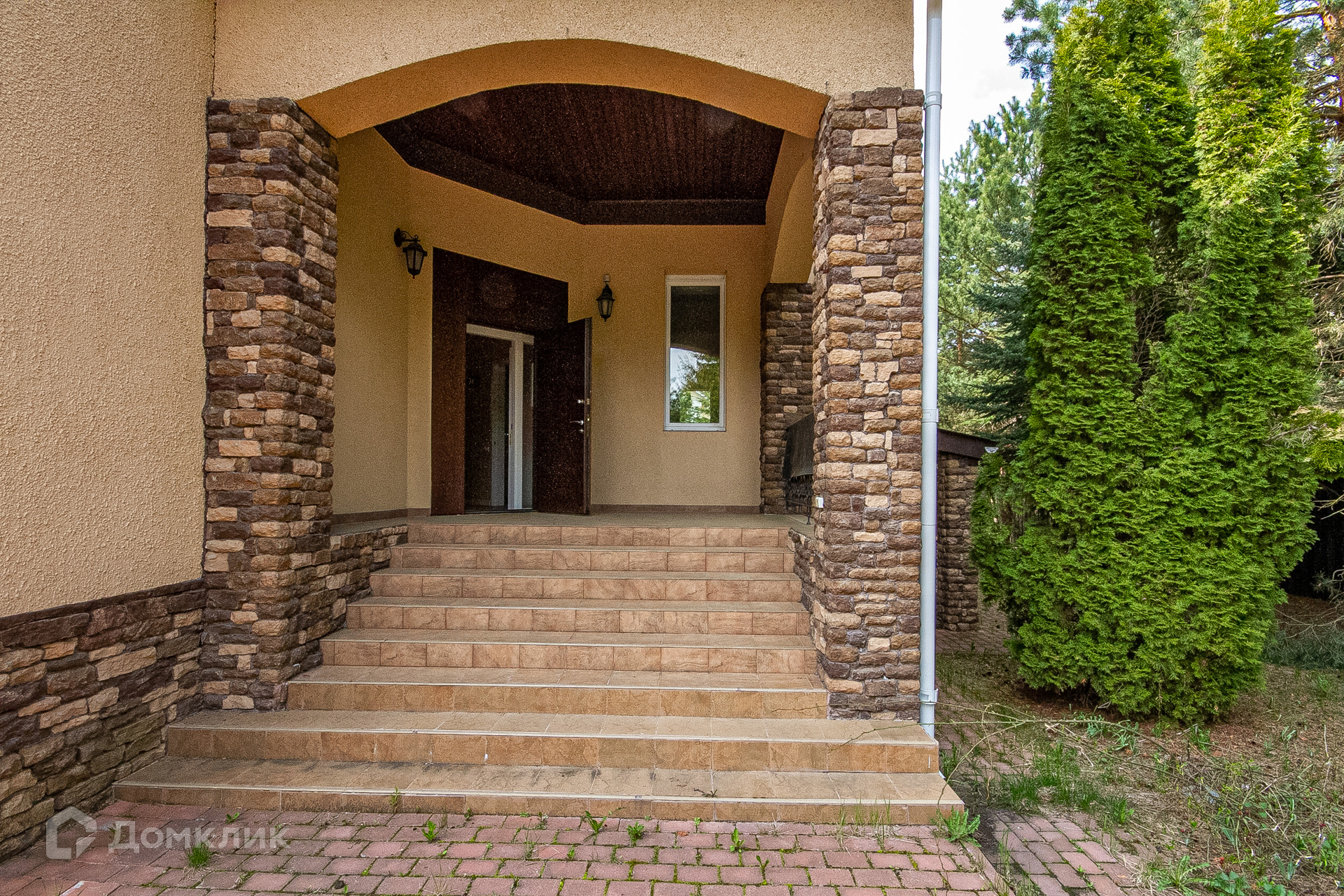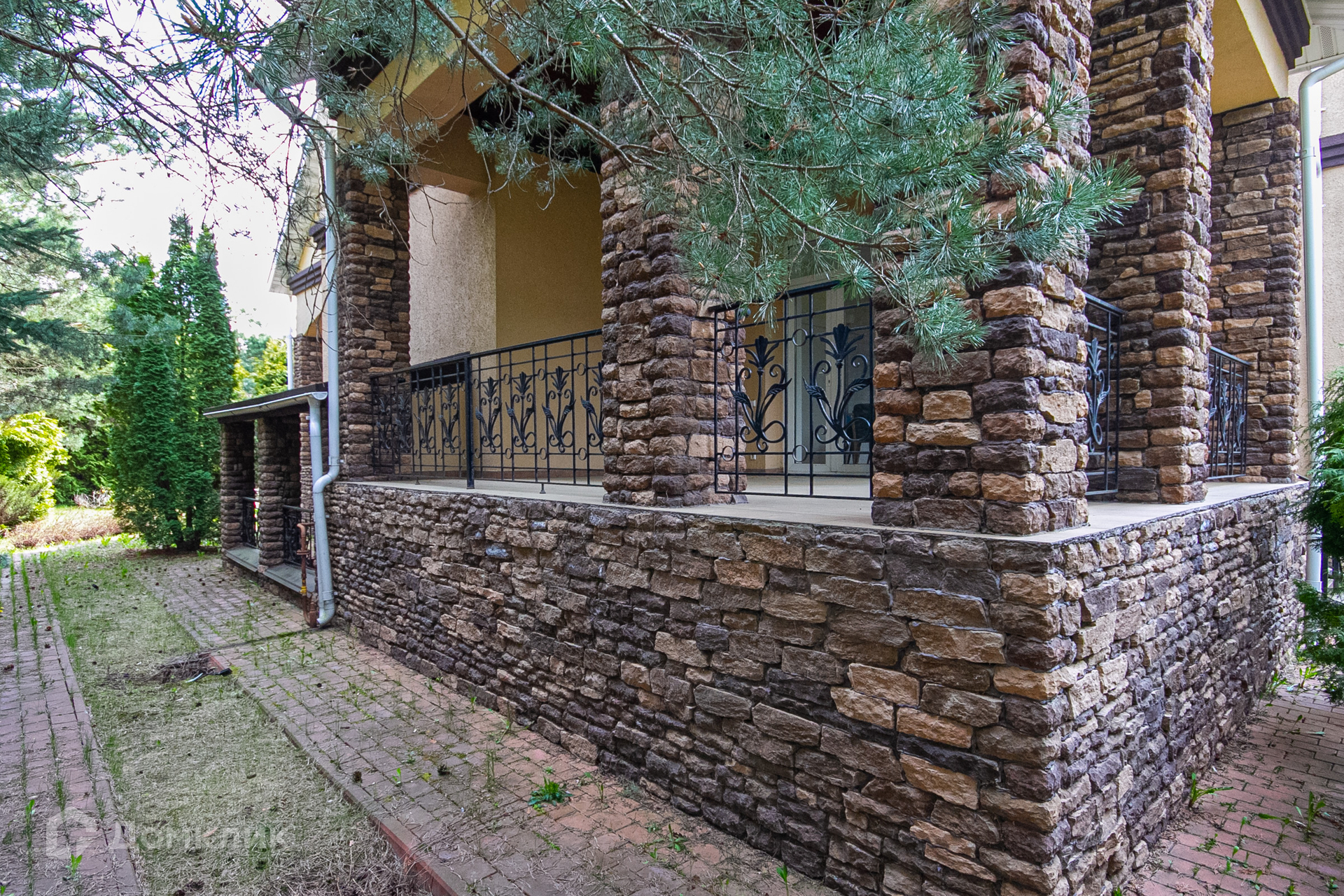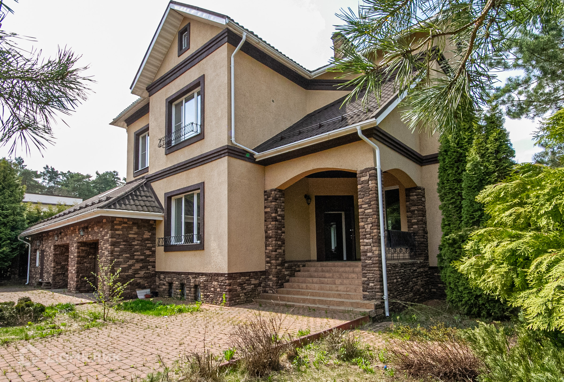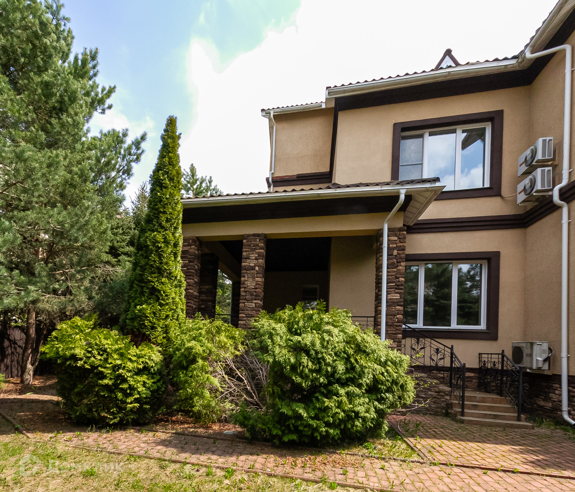Дом с террасой с прекрасным видом на зеленый садик с молодыми соснами, стройными туями, красивым декоративным кустарником, цветниками, вымощенными дорожками, уличным освещением, интересным ландшафтным дизайном.