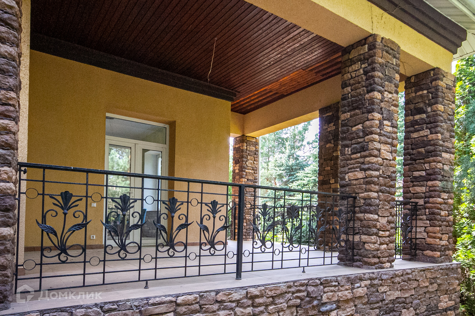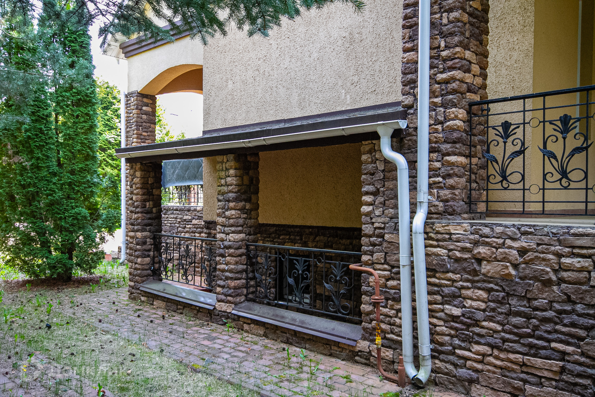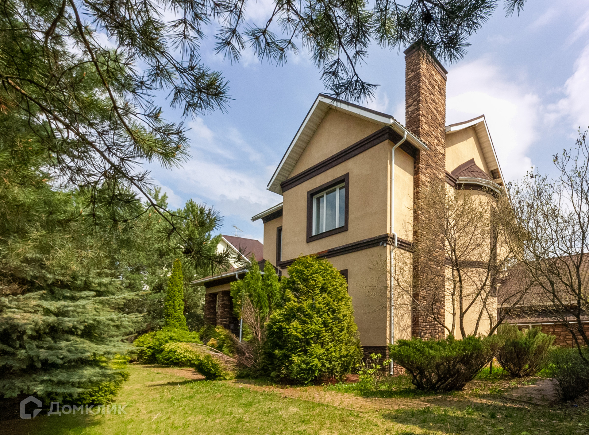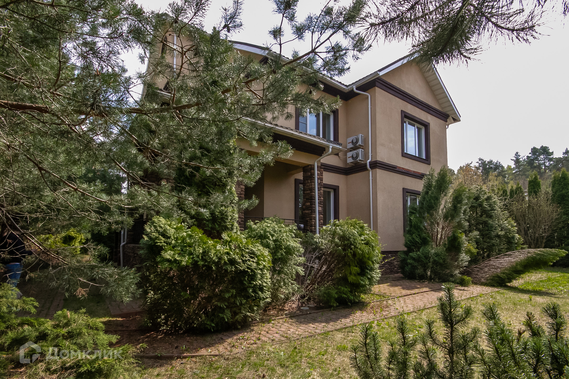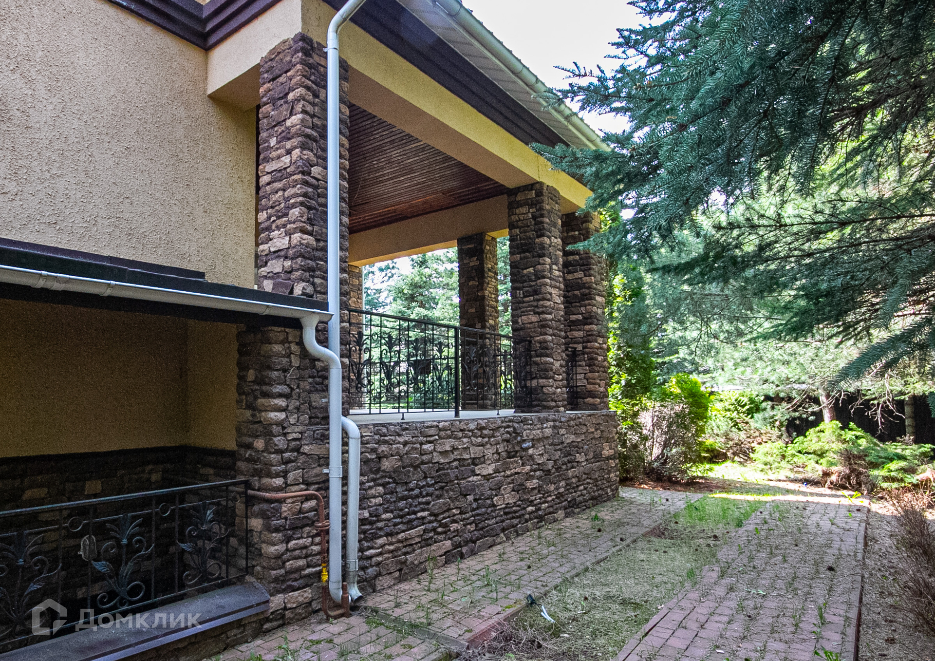 Дом с террасой с прекрасным видом на зеленый садик с молодыми соснами, стройными туями, красивым декоративным кустарником, цветниками, вымощенными дорожками, уличным освещением, интересным ландшафтным дизайном.