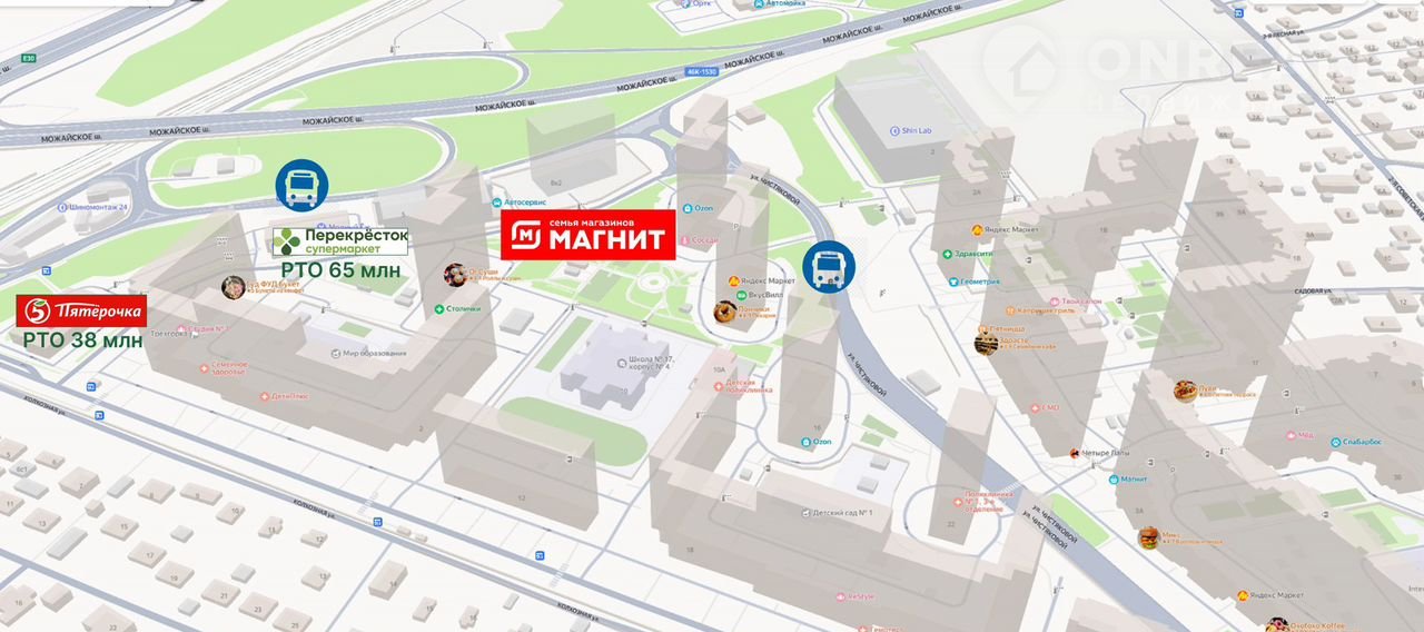 В соседних домах Перекресток торгует на 65 млн, Пятерочка на 38 млн.