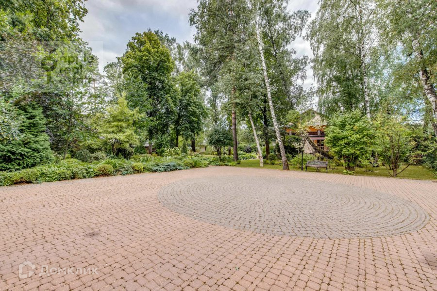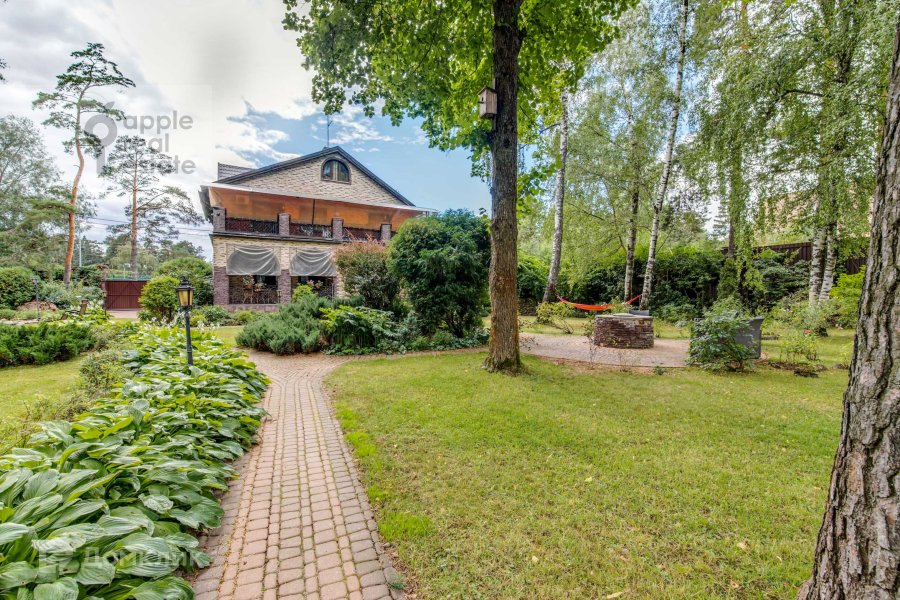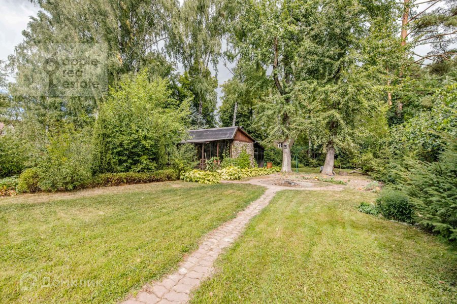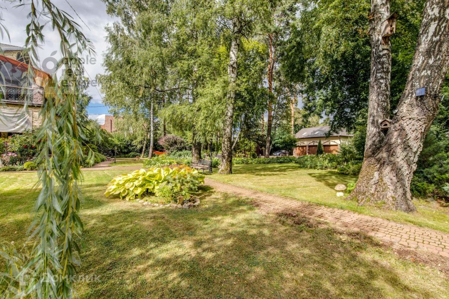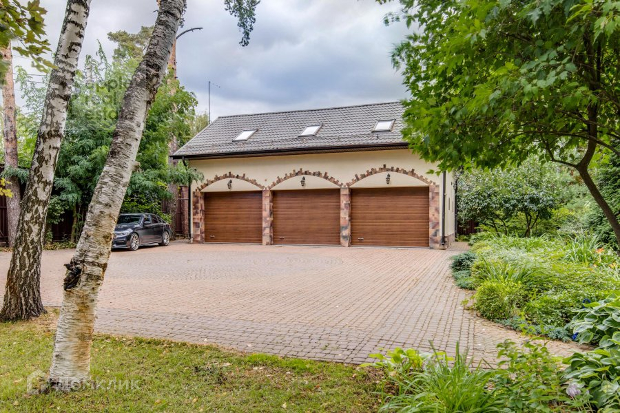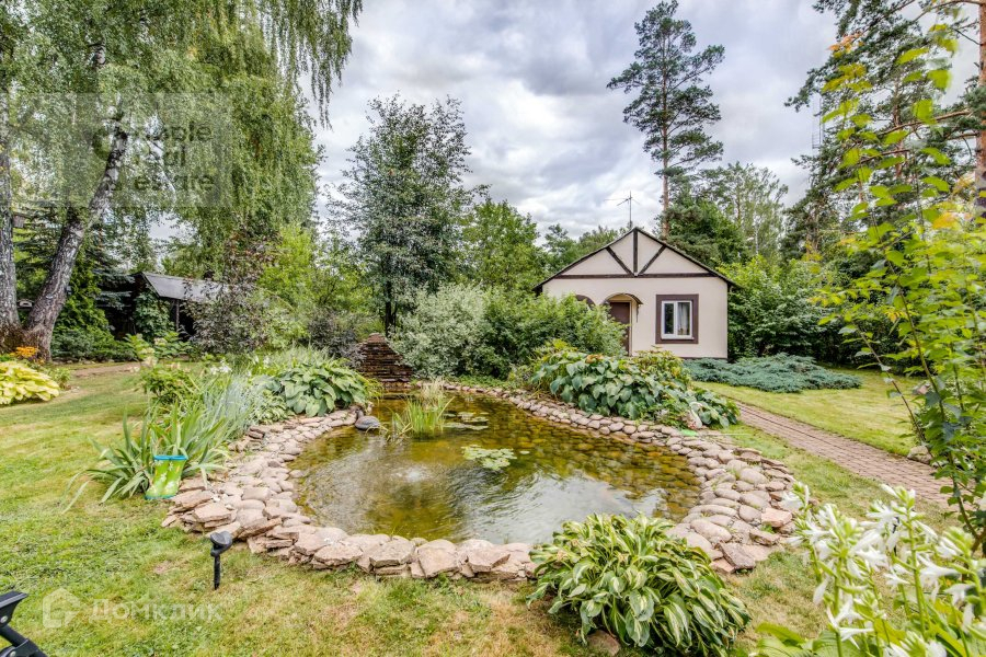 На большом тихом участке высажены взрослые деревья, застелен газон. На территории находится теплый гараж на 3 машины с 3-комнатной квартирой, крытая беседка-барбекю, домик охраны, парковка на несколько автомобилей и искусственный пруд.