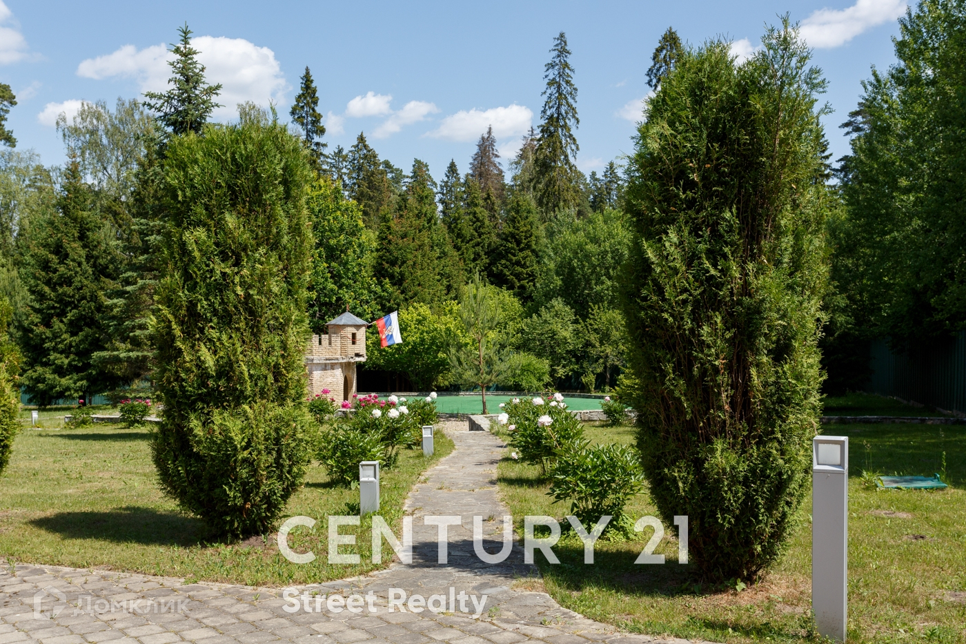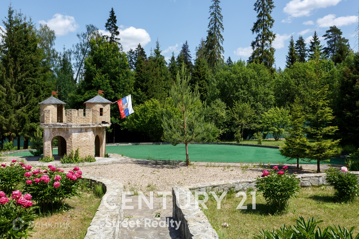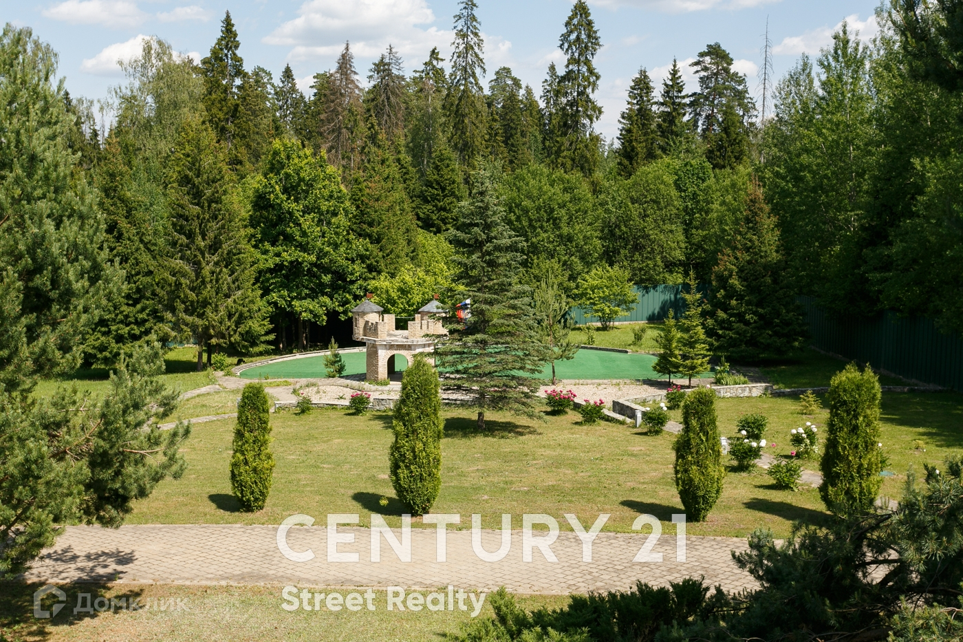 Территория загородной резиденции ухожена, освещена, Высажены цветы, ели, вековые сосны. Есть площадка для гольфа, которую возможно переоборудовать в детскую площадку.