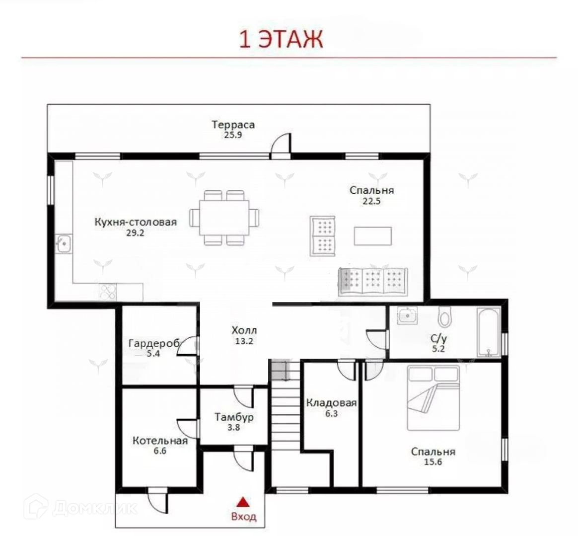 Функциональная планировка дома предполагает организацию просторной кухни-гостиной с выходом на террасу и во внутренний двор и возможностью установки камина. Также на первом этаже свободно разместятся кабинет, ванная комната и хозяйственные помещения: гардеробная, кладовая и полностью оборудованная котельная. Второй этаж - место для создания приватной атмосферы: здесь можно разместить две мастер-спальни и детскую с собственными ванными комнатами и гардеробными.