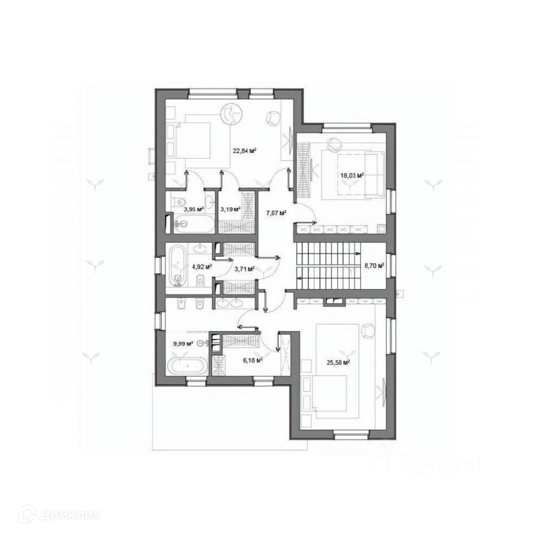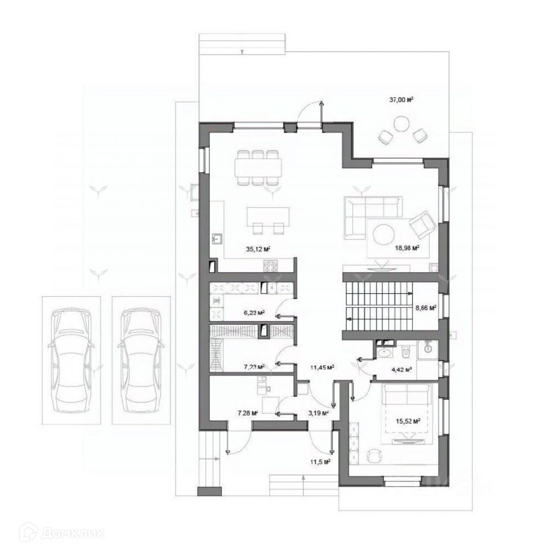 Функциональная планировка дома предполагает организацию просторной кухни-гостиной с выходом на террасу и во внутренний двор и возможностью установки камина. Также на первом этаже свободно разместятся кабинет, ванная комната и хозяйственные помещения: гардеробная, кладовая и полностью оборудованная котельная. Второй этаж - место для создания приватной атмосферы: здесь можно разместить две мастер-спальни и детскую с собственными ванными комнатами и гардеробными.