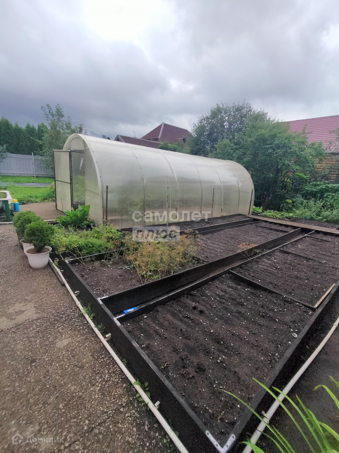 Большая теплица, Емкости для полива насаждений. по всему периметру огорода протянуты трубы для удобства полива