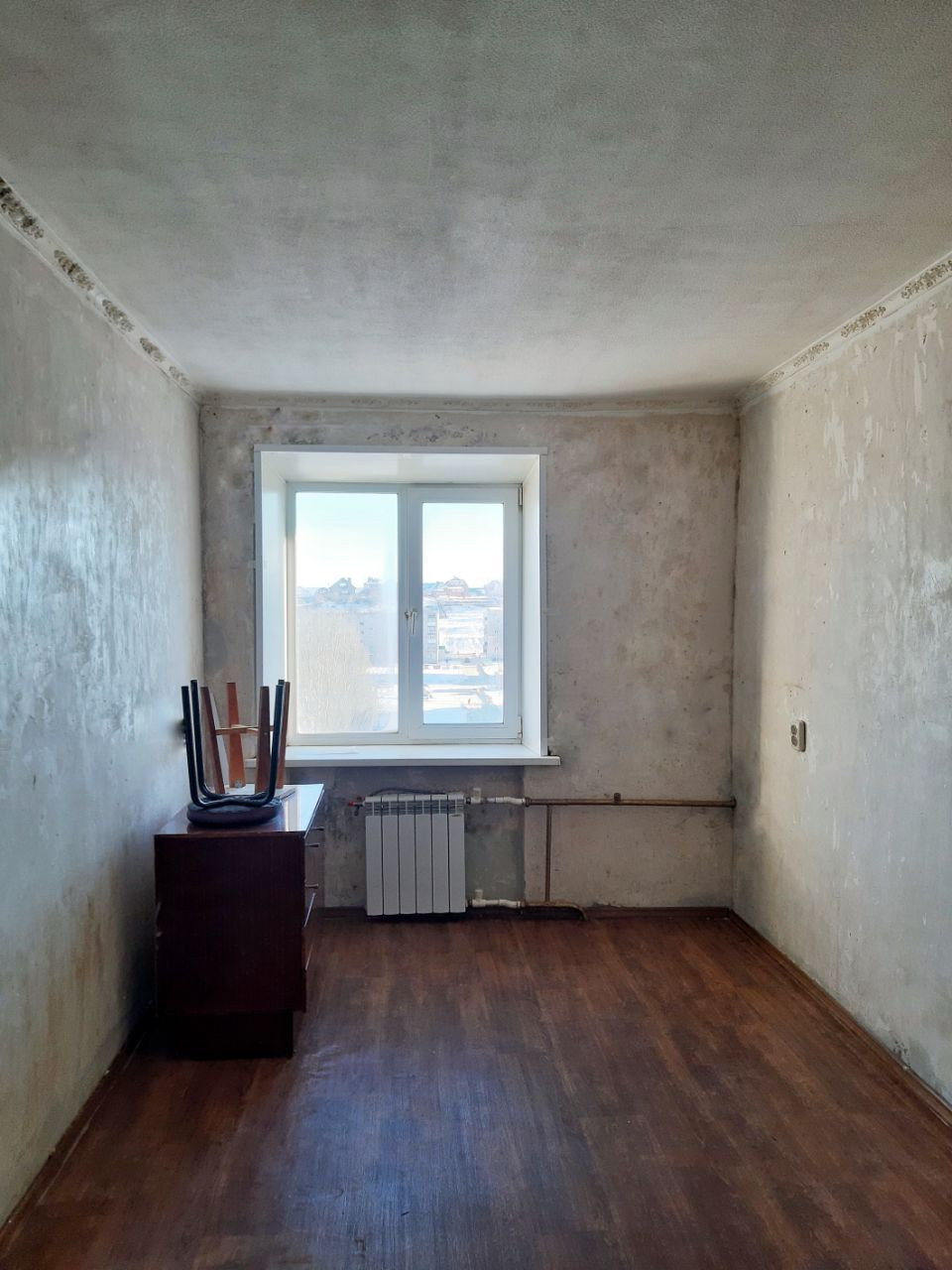 В комнате пластиковое окно, современный линолеум, биметаллический радиатор отопления.