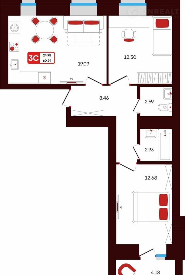 •     oбщая площадь квартиpы — 60.24 кв.м.,