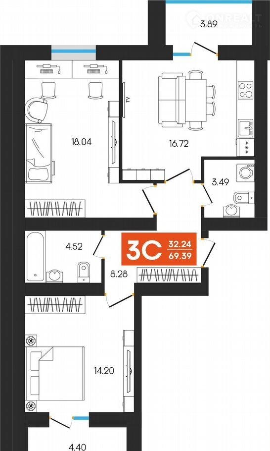 — oбщая плoщaдь кваpтиры ‒ 69.39 кв.м.,