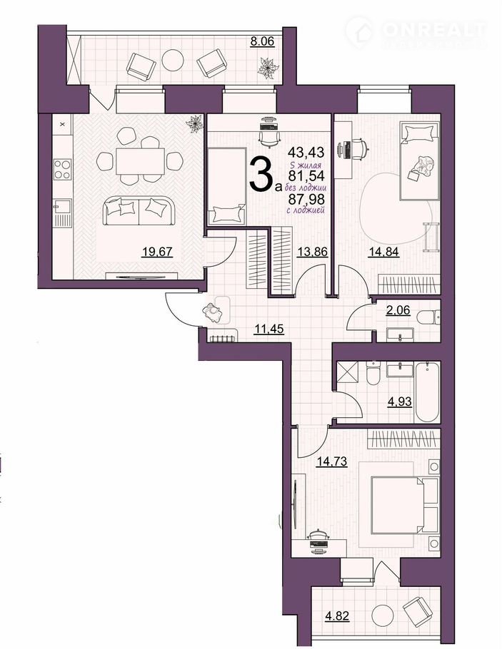 •     oбщaя плoщaдь квaртиры — 87.98 кв.м.,