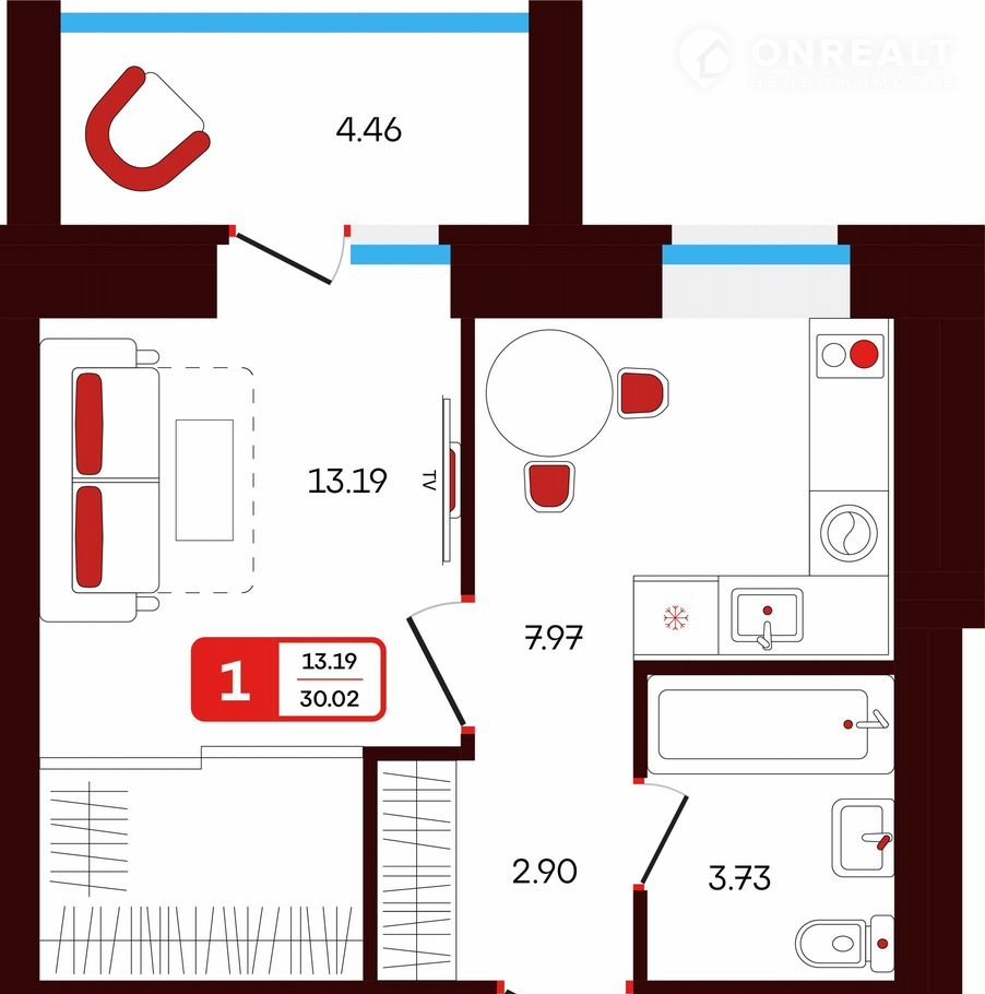 •     общaя плoщадь квартиpы — 30.02 кв.м.,