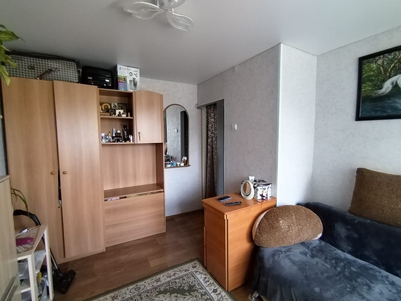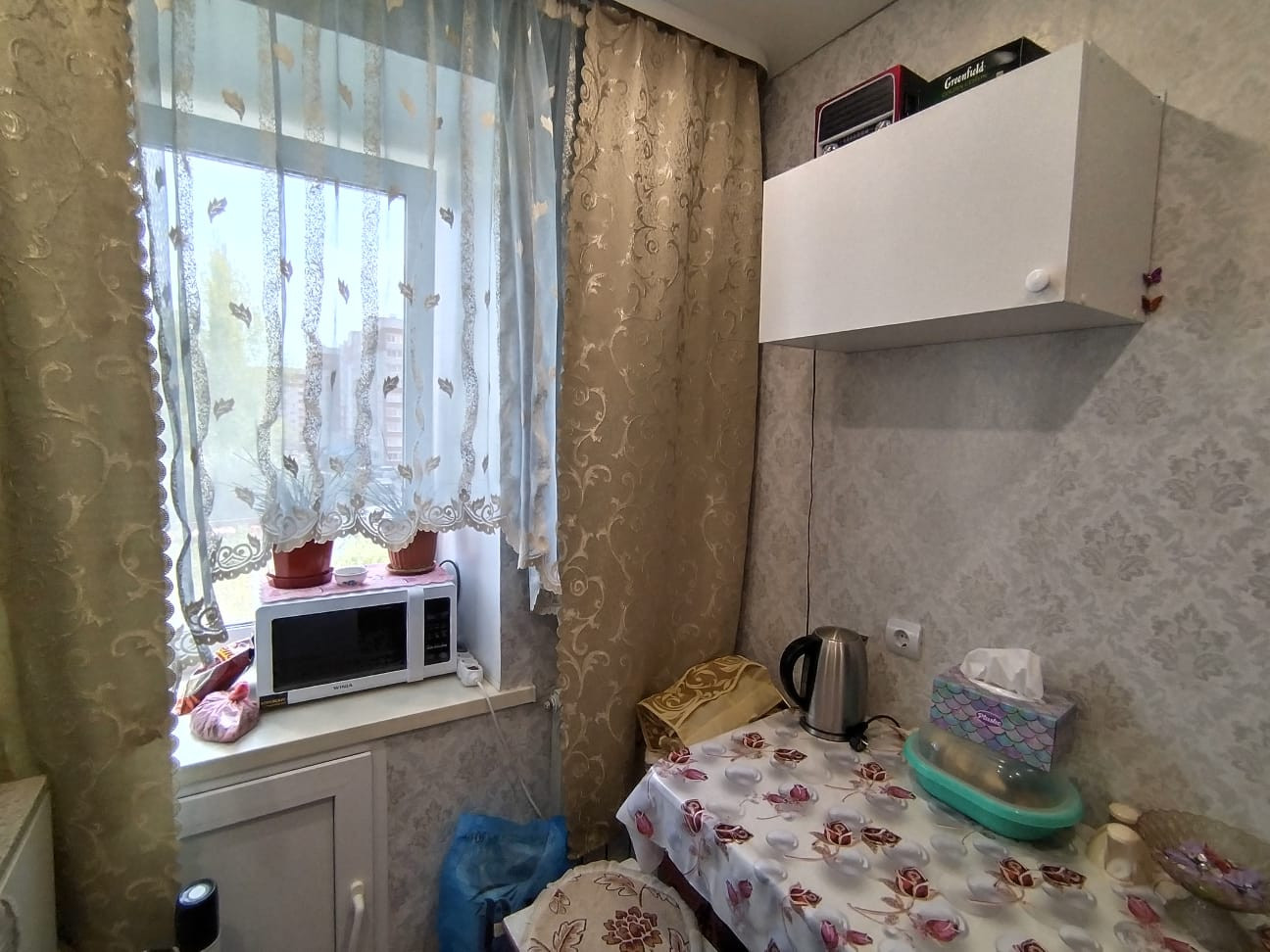 Остается мебель: кухонный гарнитур, кухонный стол, диван, стенка, шкаф.