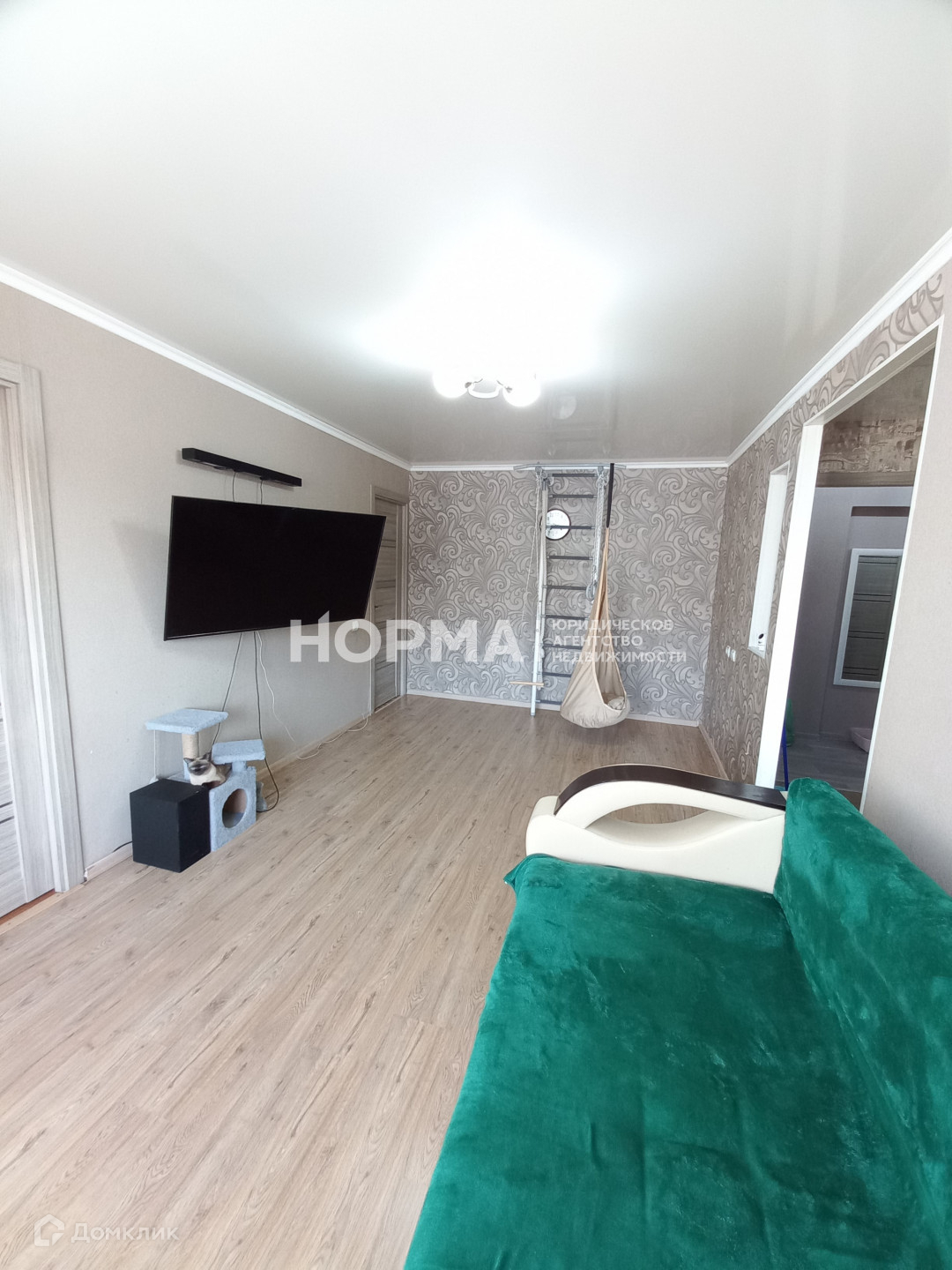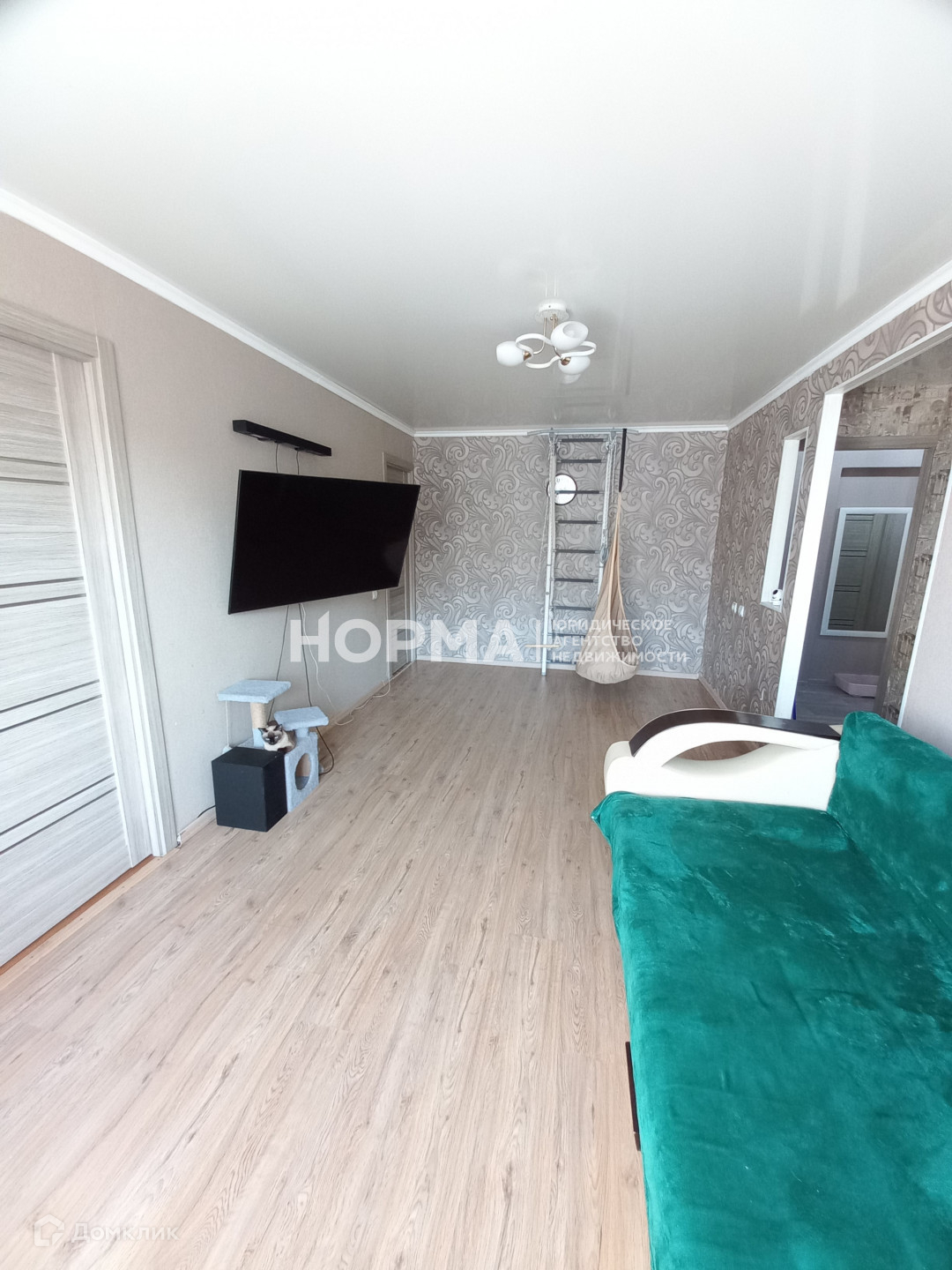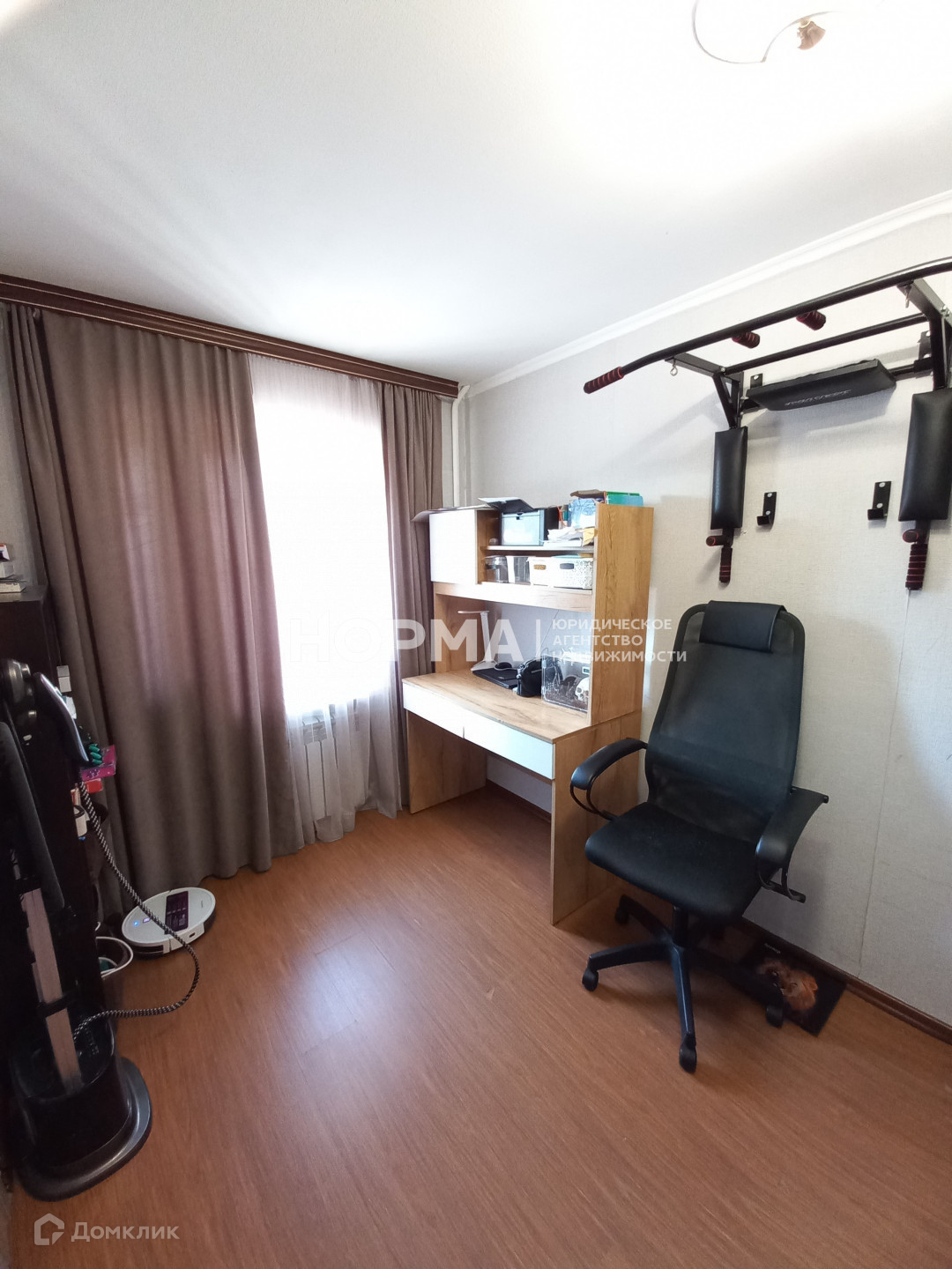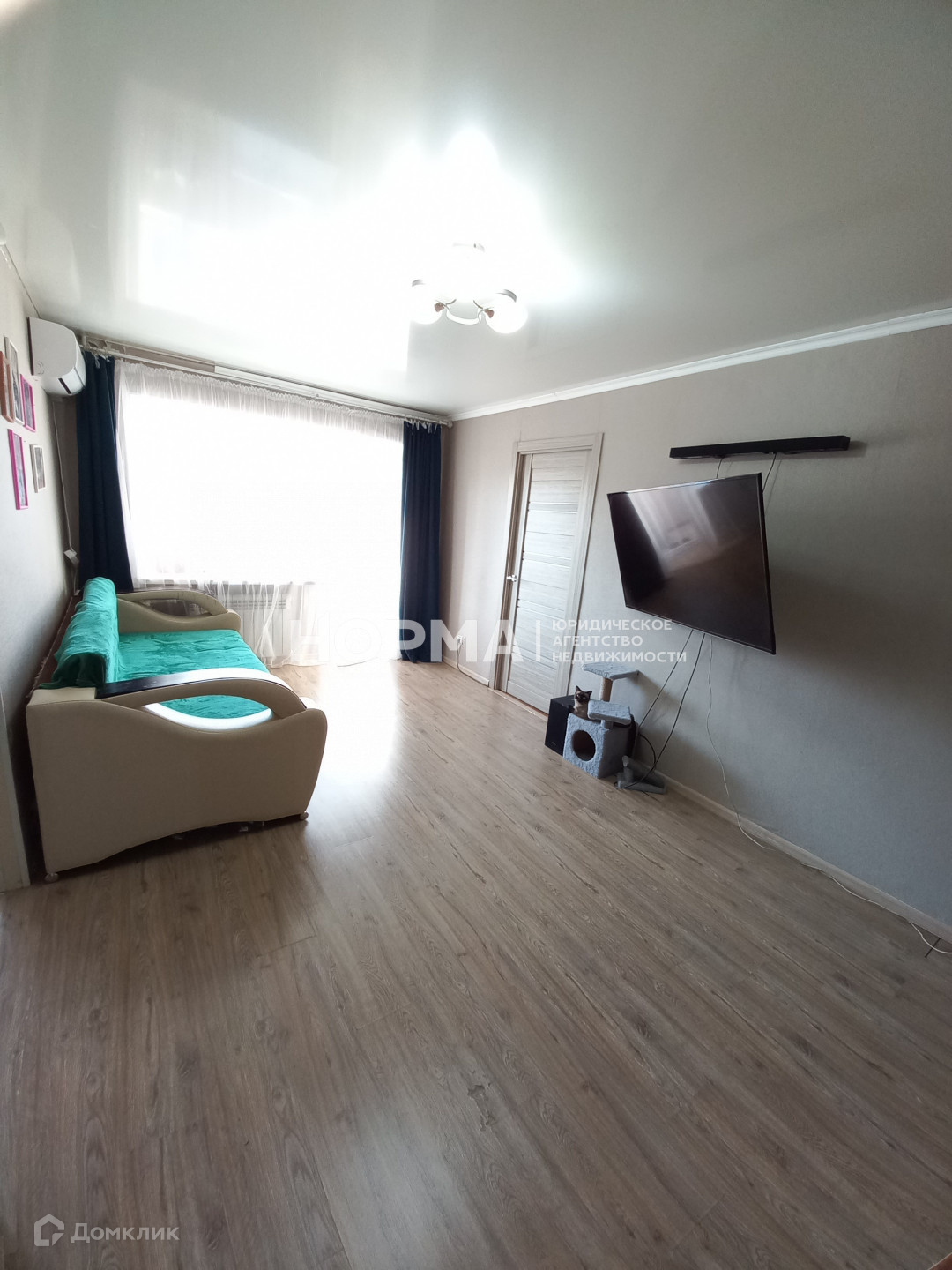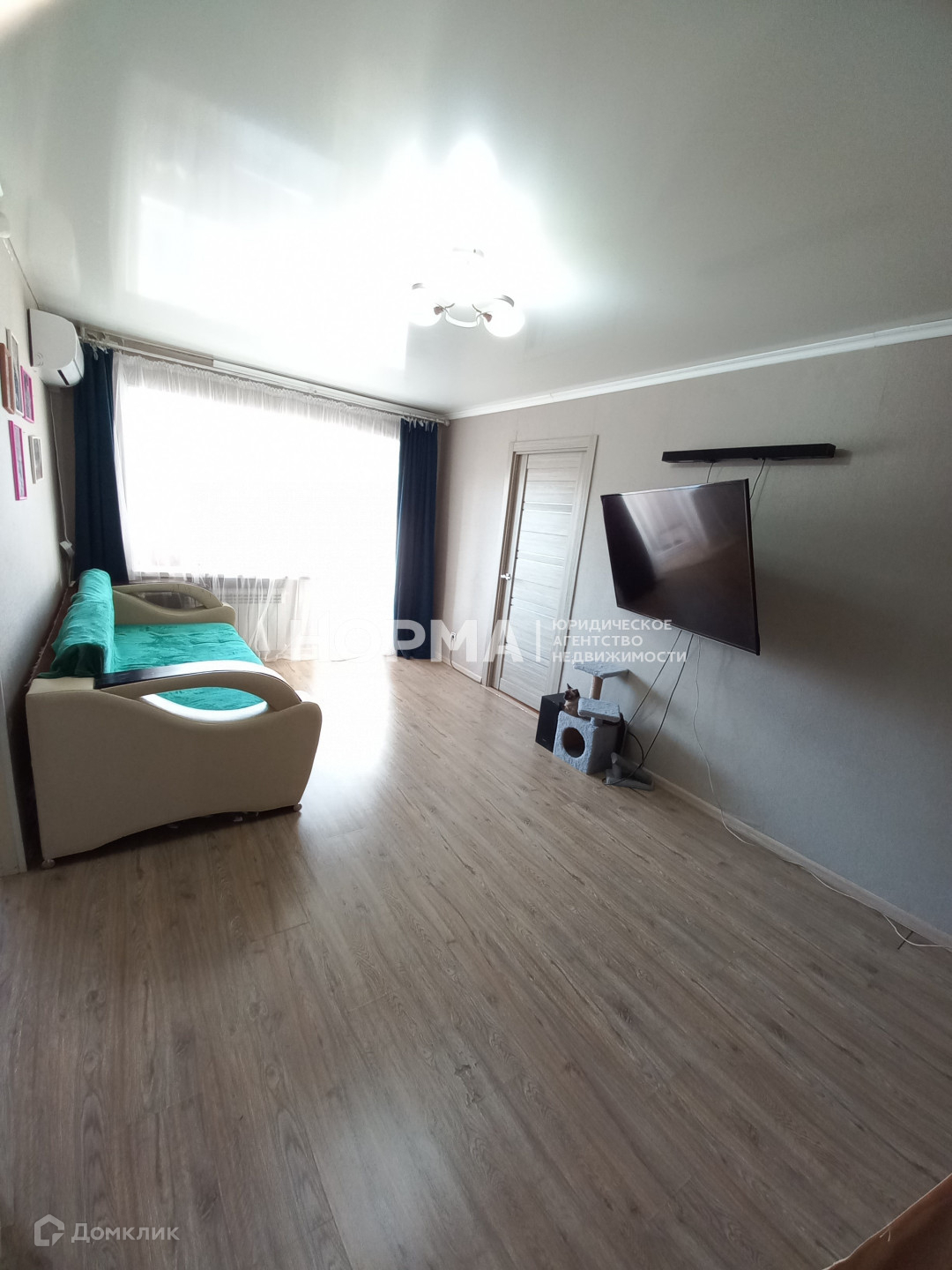 Зал просторный, на полу ламинат. Установлен кондиционер (остаётся в подарок новым собственникам).