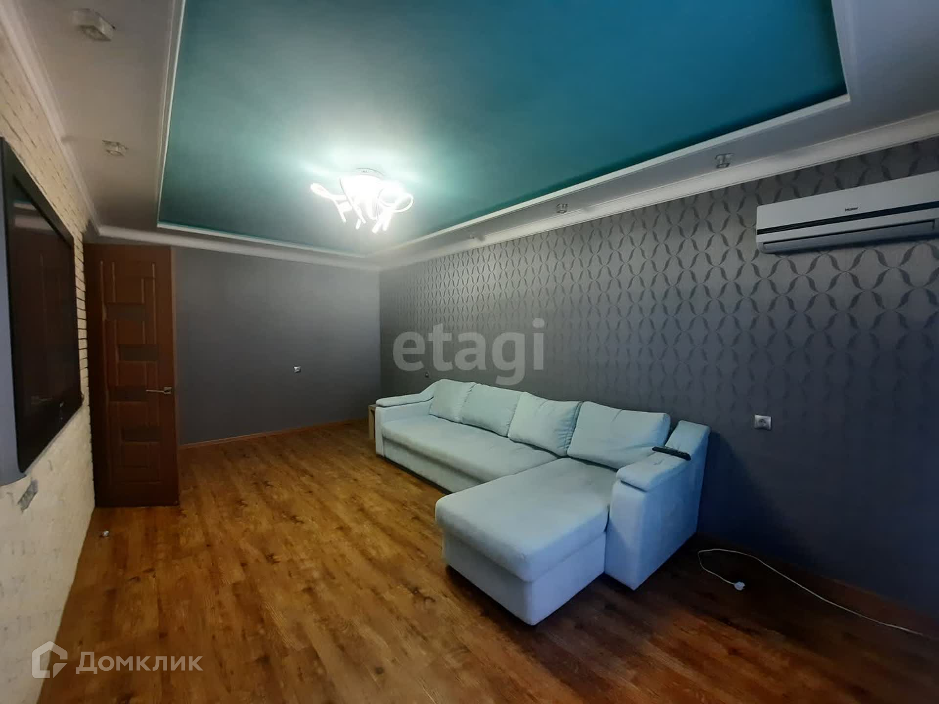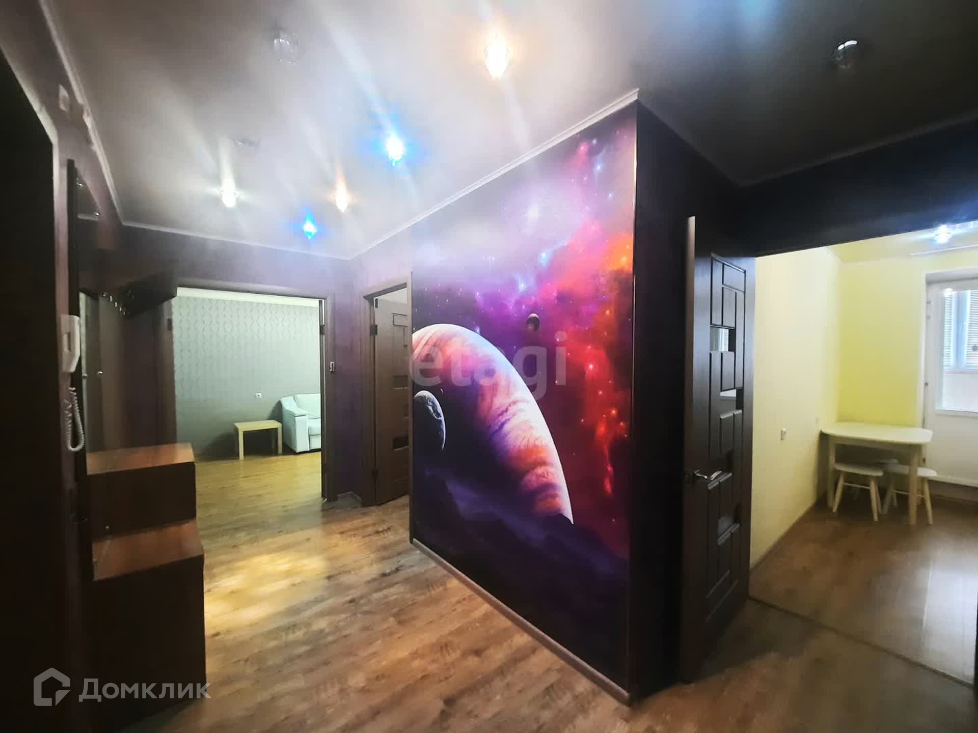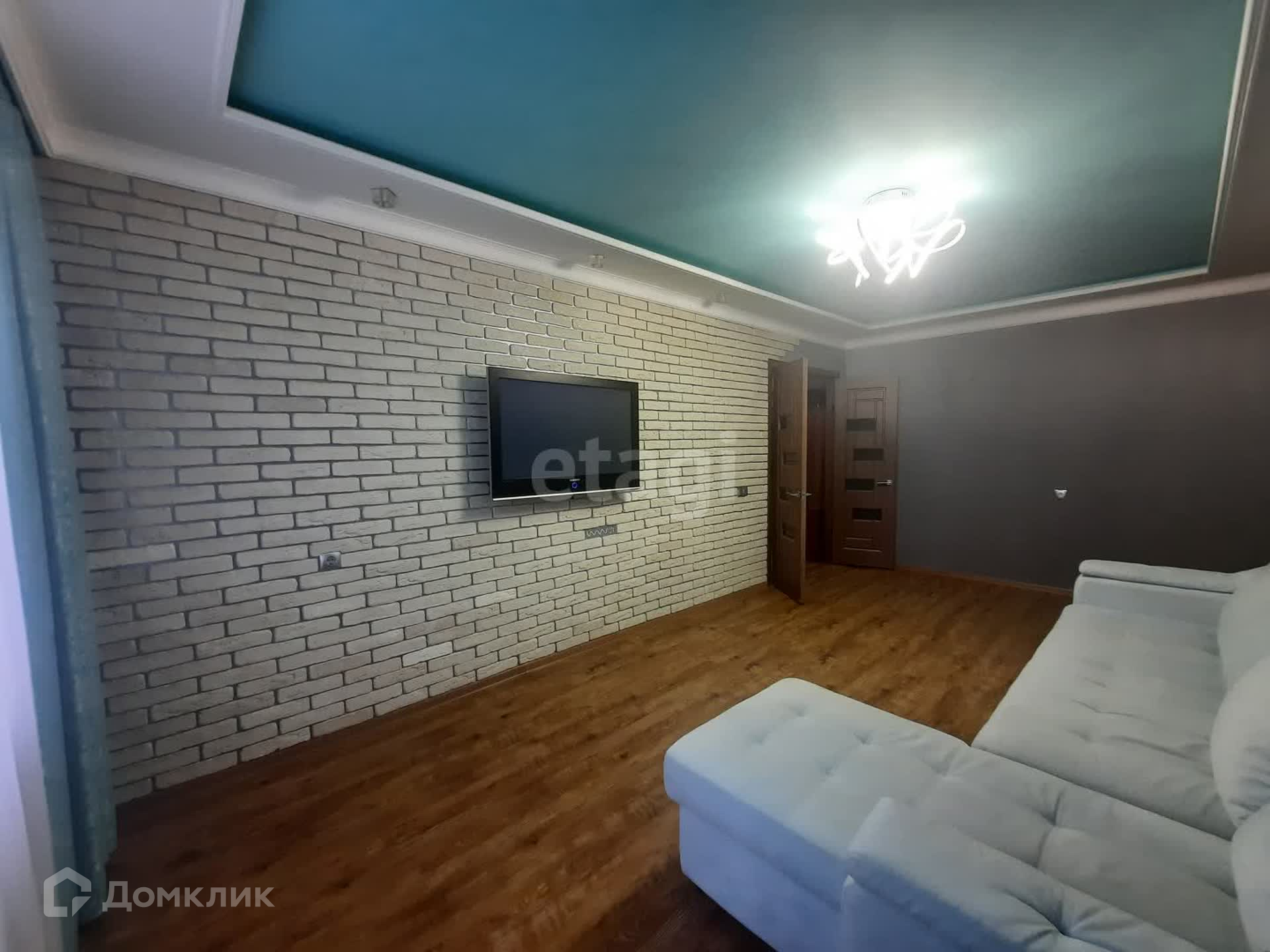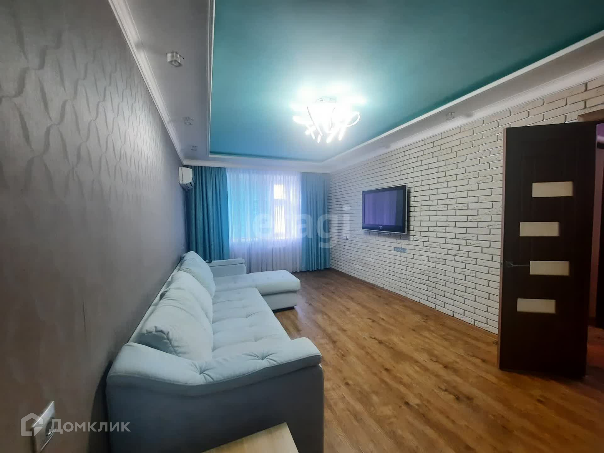 В квартире выполнен качественный ремонт, все в единой стилистике, по всей площади пола уложен ламинат высшей категории, на стенах обои, потолки двухуровневые с дополнительным освещение.
