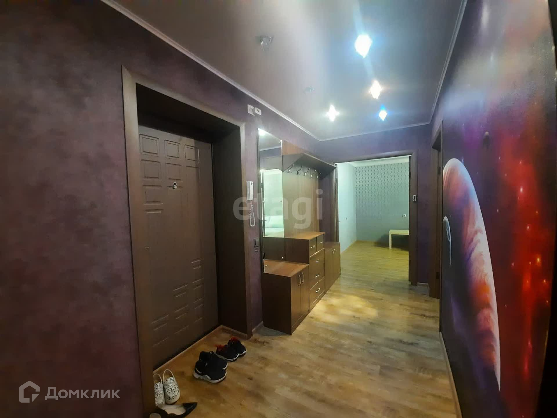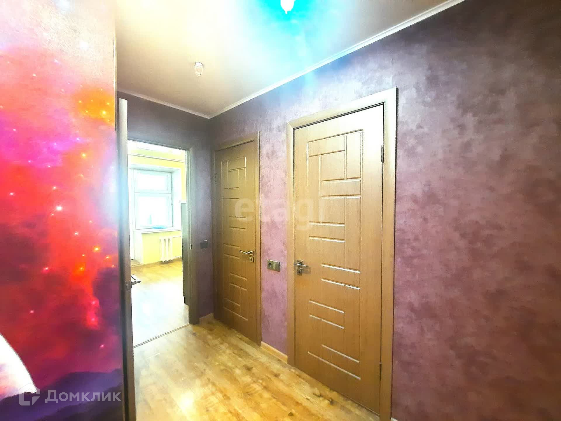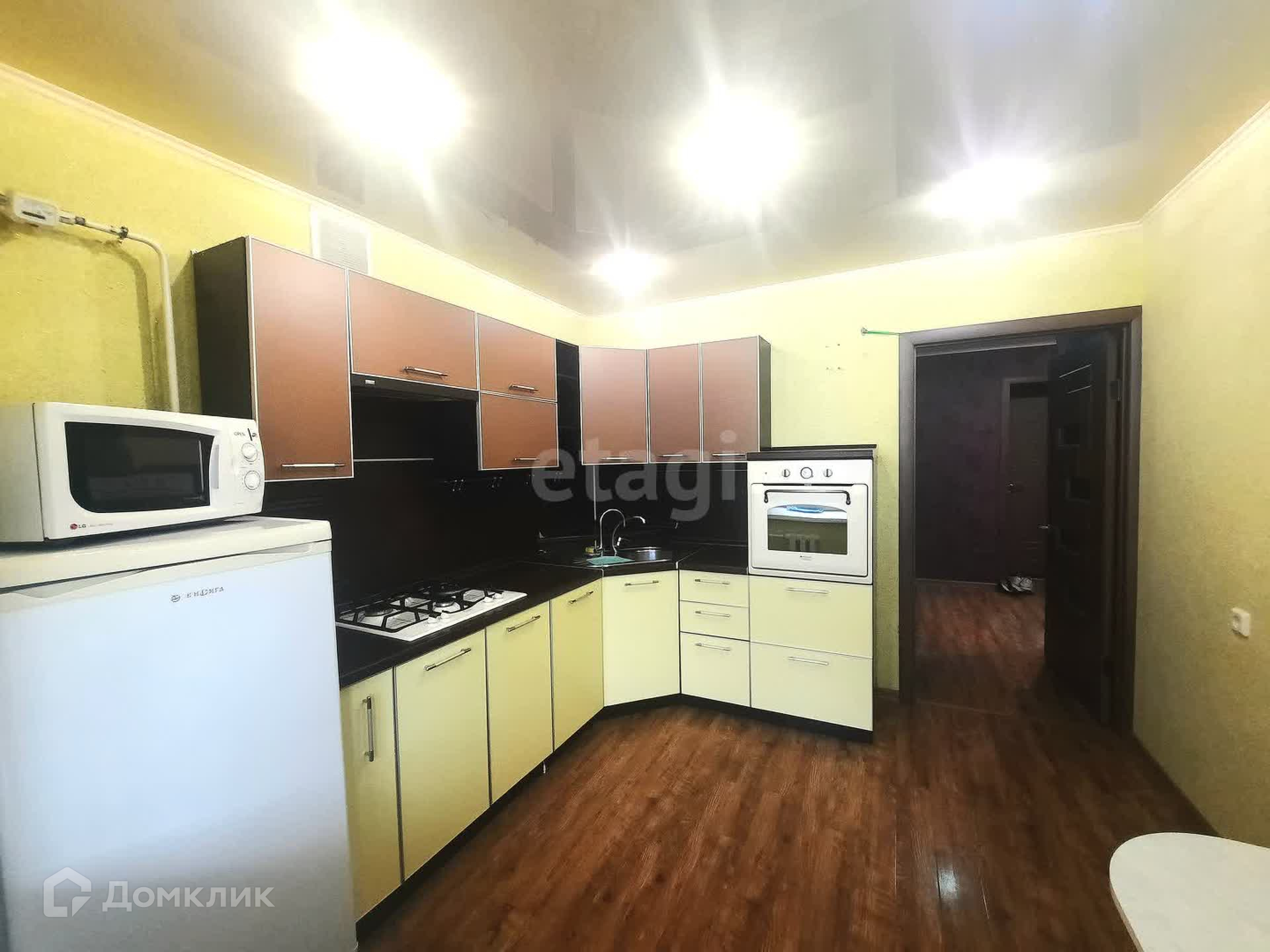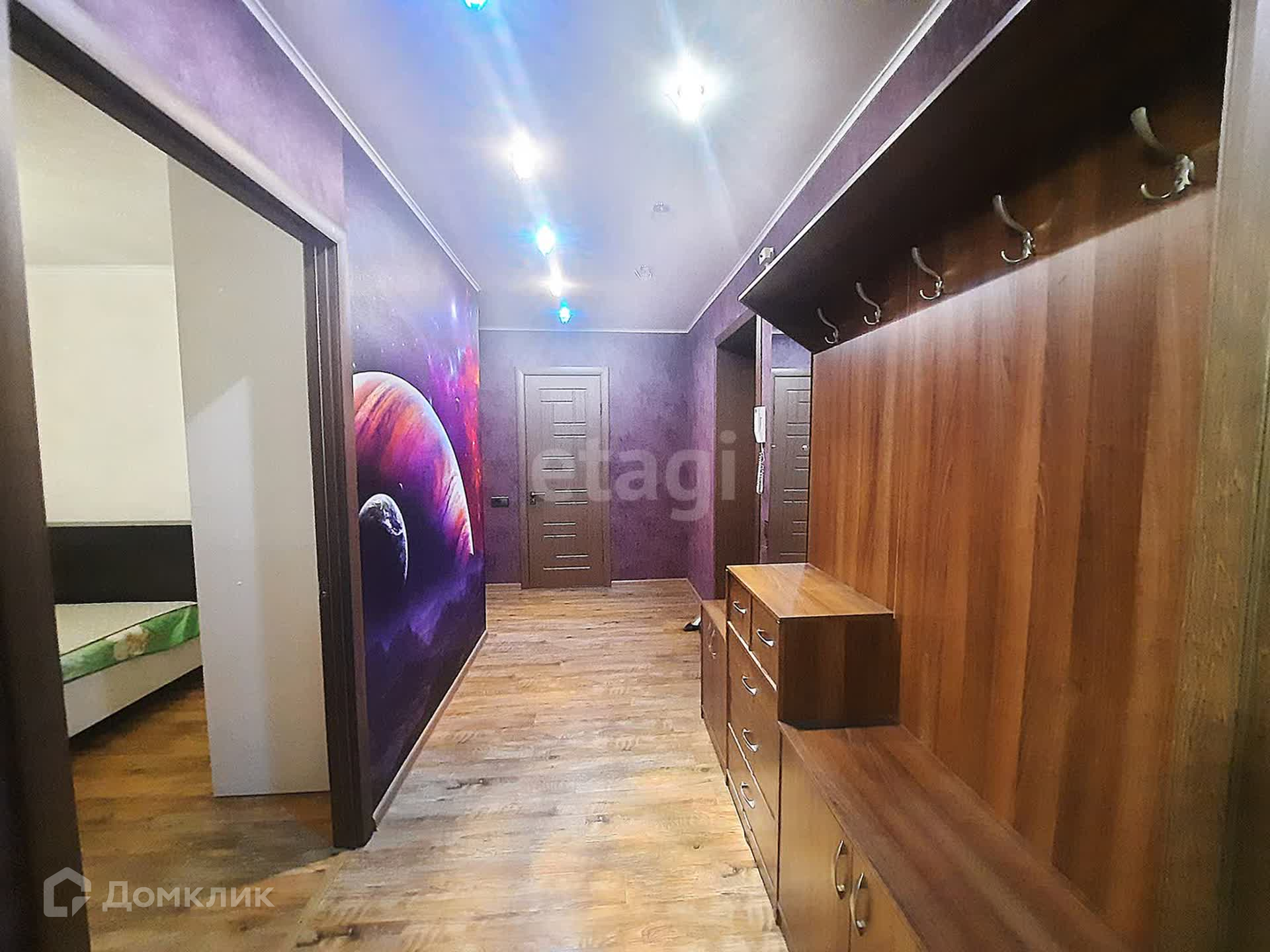 В квартире выполнен качественный ремонт, все в единой стилистике, по всей площади пола уложен ламинат высшей категории, на стенах обои, потолки двухуровневые с дополнительным освещение.