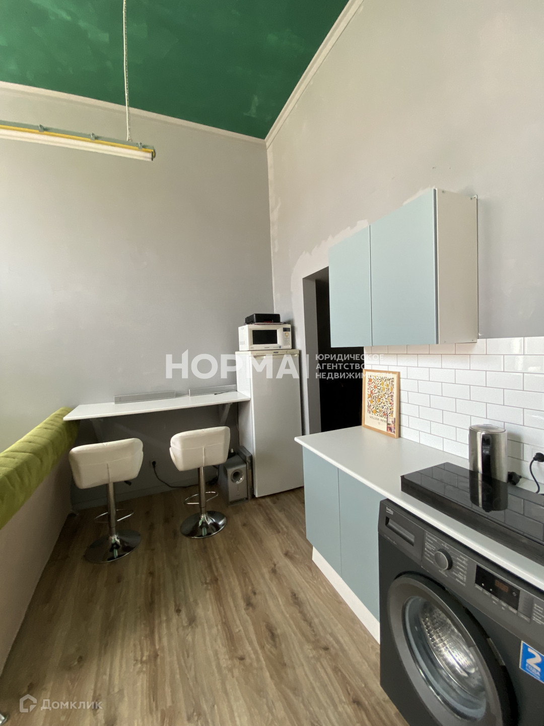 остается современный кухонный гарнитур, варочная панель, холодильник, стиральная машина, кухонный стол, барные стулья, диван, телевизор.