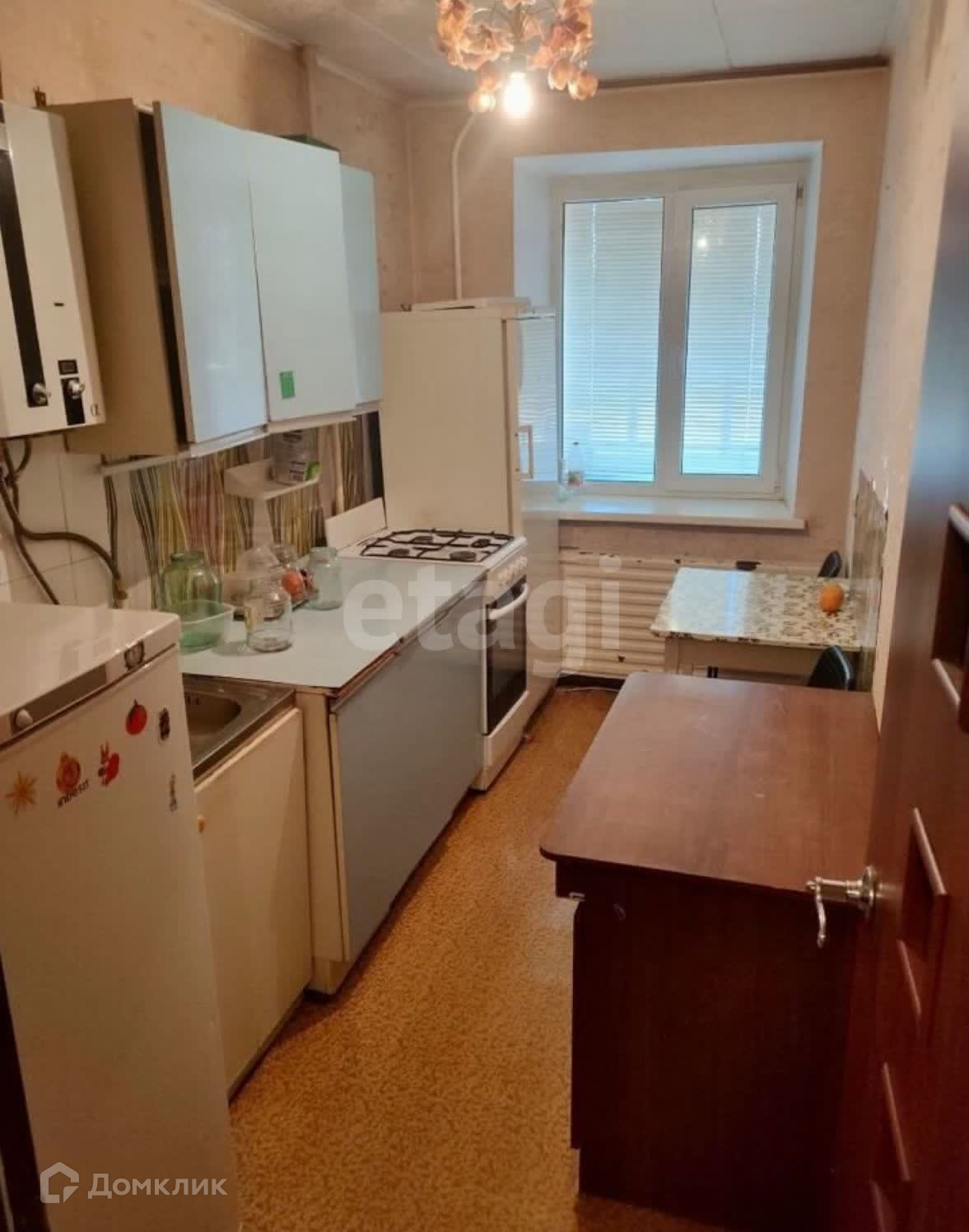 В квартире сделан косметический ремонт, окна пластик, на полу линолеум, сан. узел в плитке. На кухне новая газовая колонка. Площадь кухни 9 кв. м.
