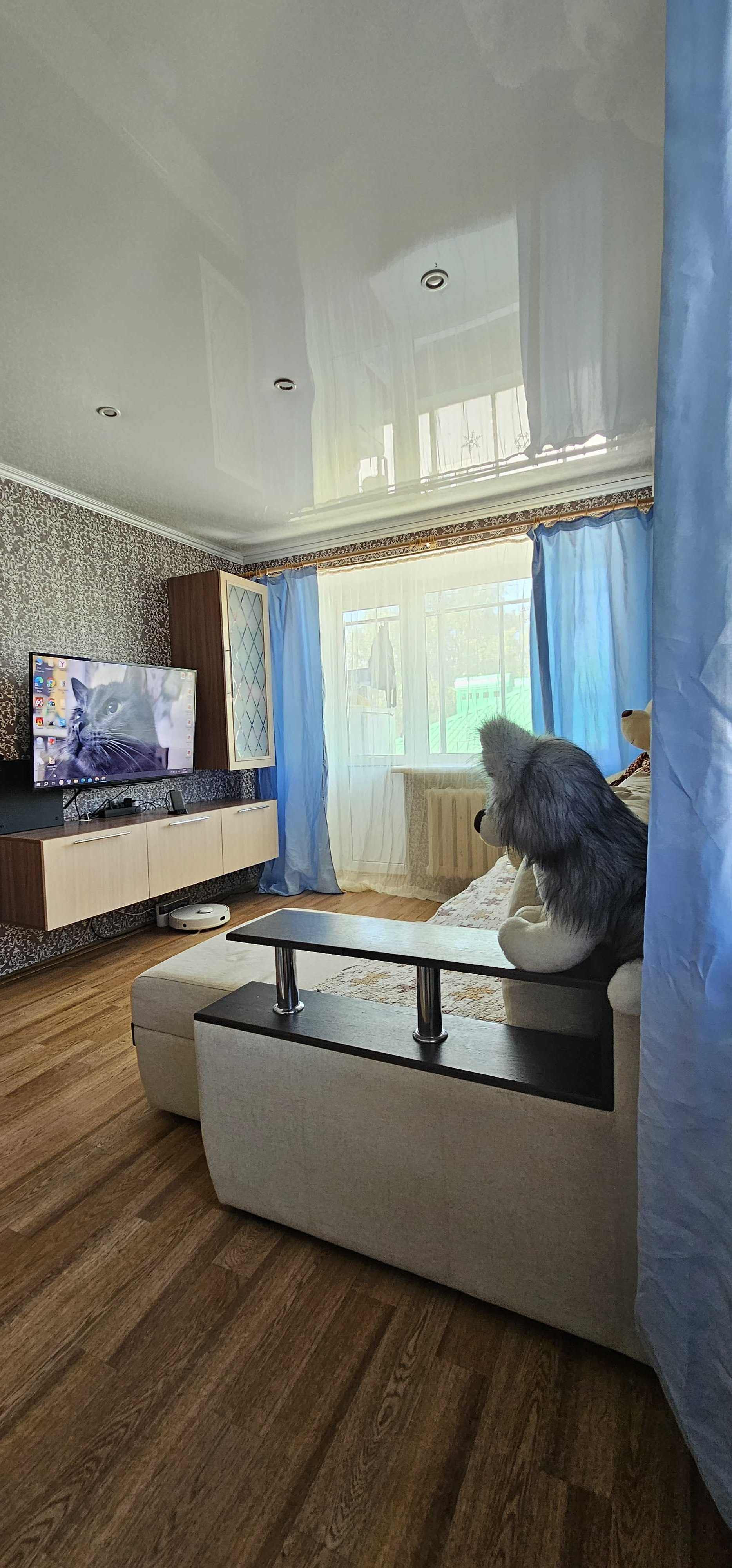 Потолоки в квартире натяжные белые глянцевые с точечными светильниками. Окна пластиковые выходят во двор и на улицу, балкон застекленный.