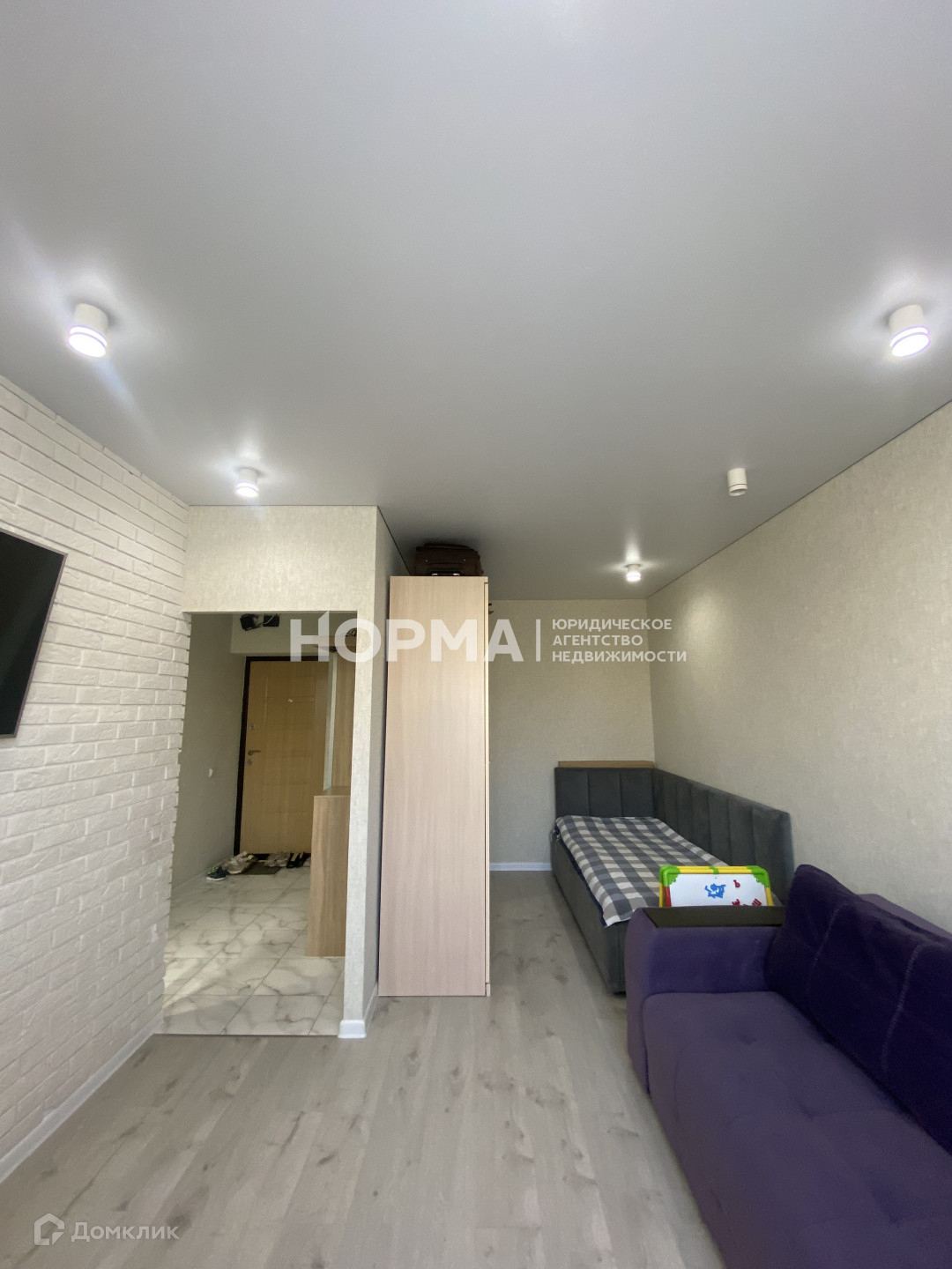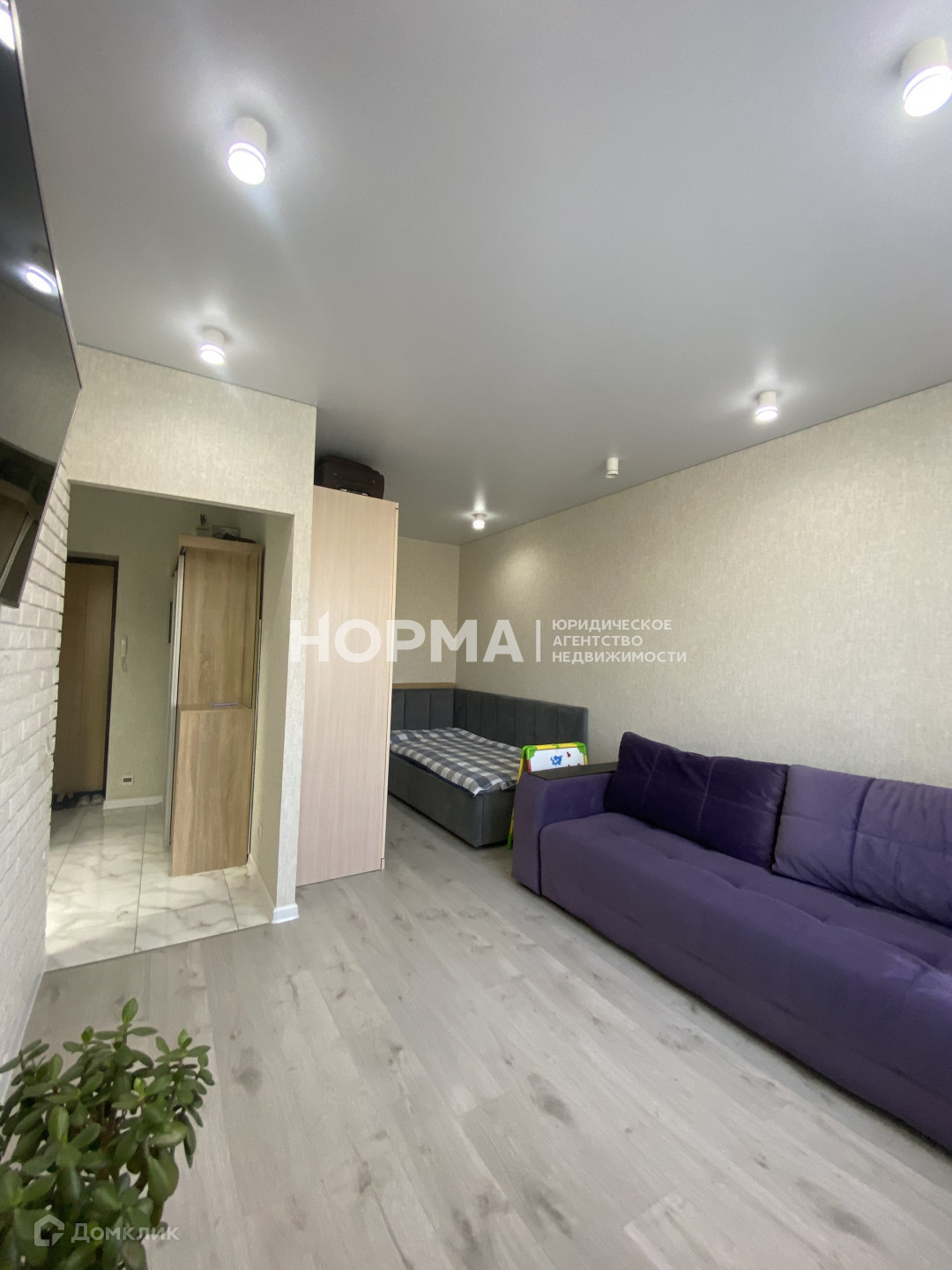 в гостиной глубокая ниша, что позволяет установить шкаф купе, или двухспальную кровать!