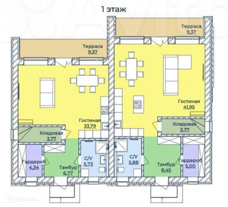 1 этаж - просторная гостиная 40,2м2, кухня 9,6, санузел 2,5м2, коридор 9,2м2