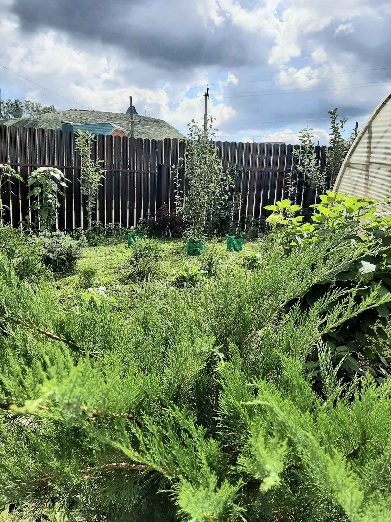 На благоустроенном участке есть теплица, беседка и мангальная зона, высажены туи, ива, оформление декоративными элементами - мостик, пруд и т.п.