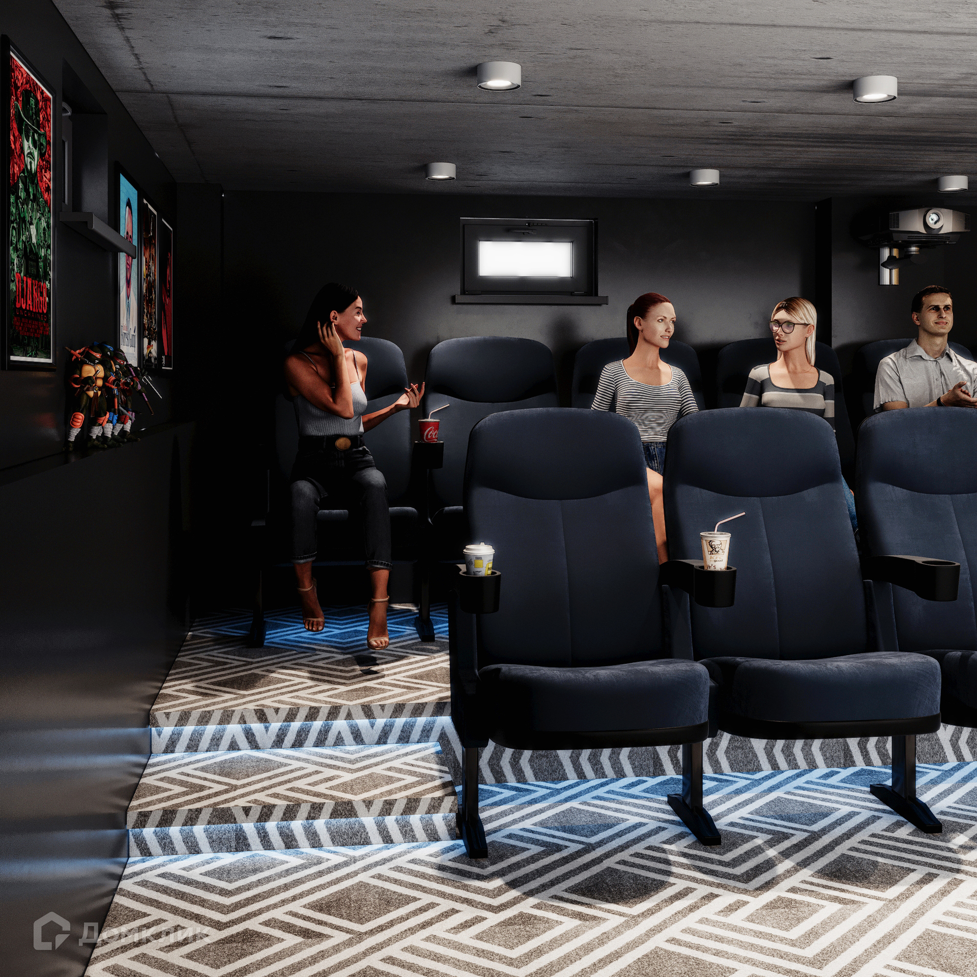 На цокольном этаже кухня-студия самообслуживания и кинозал.