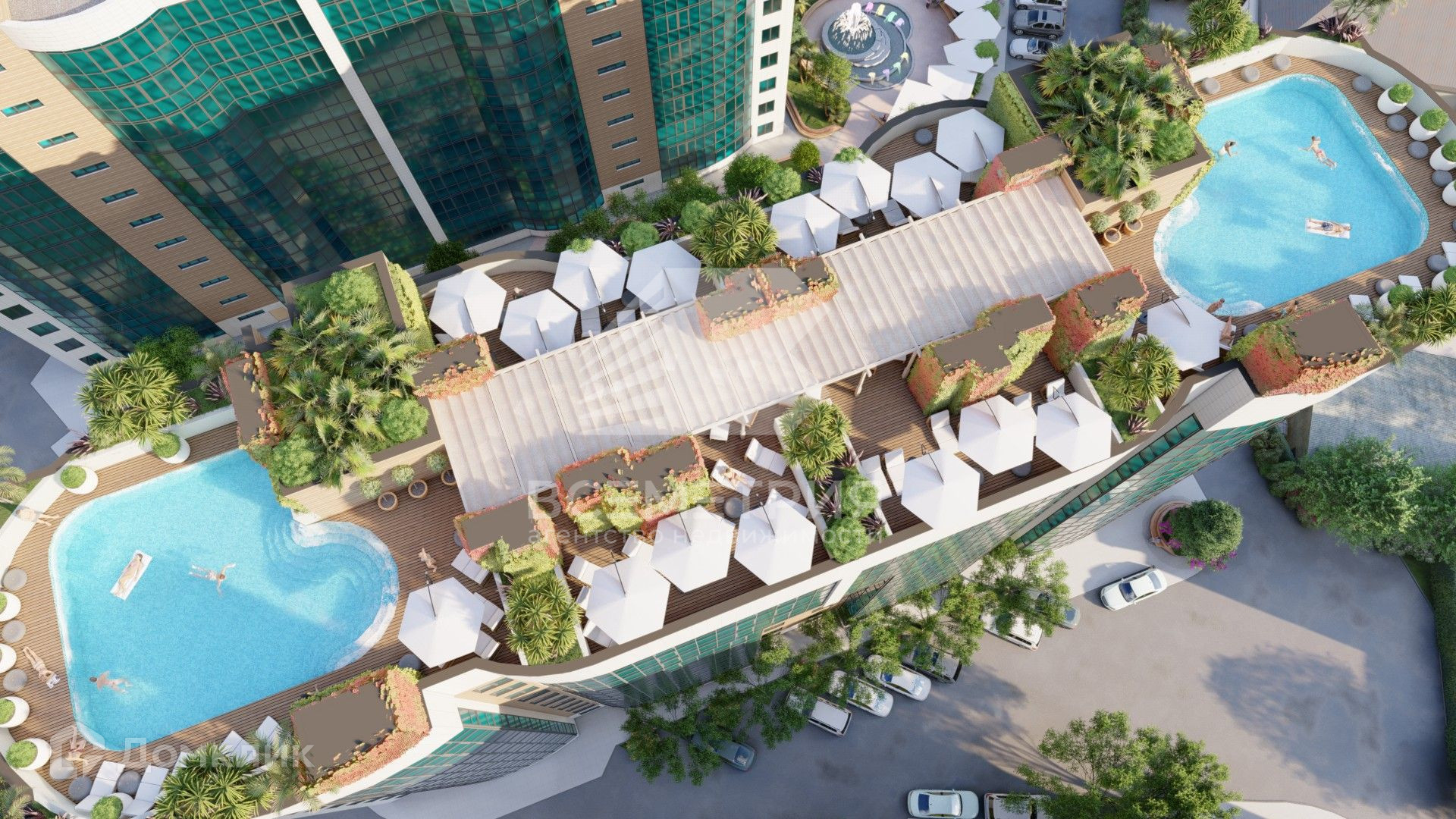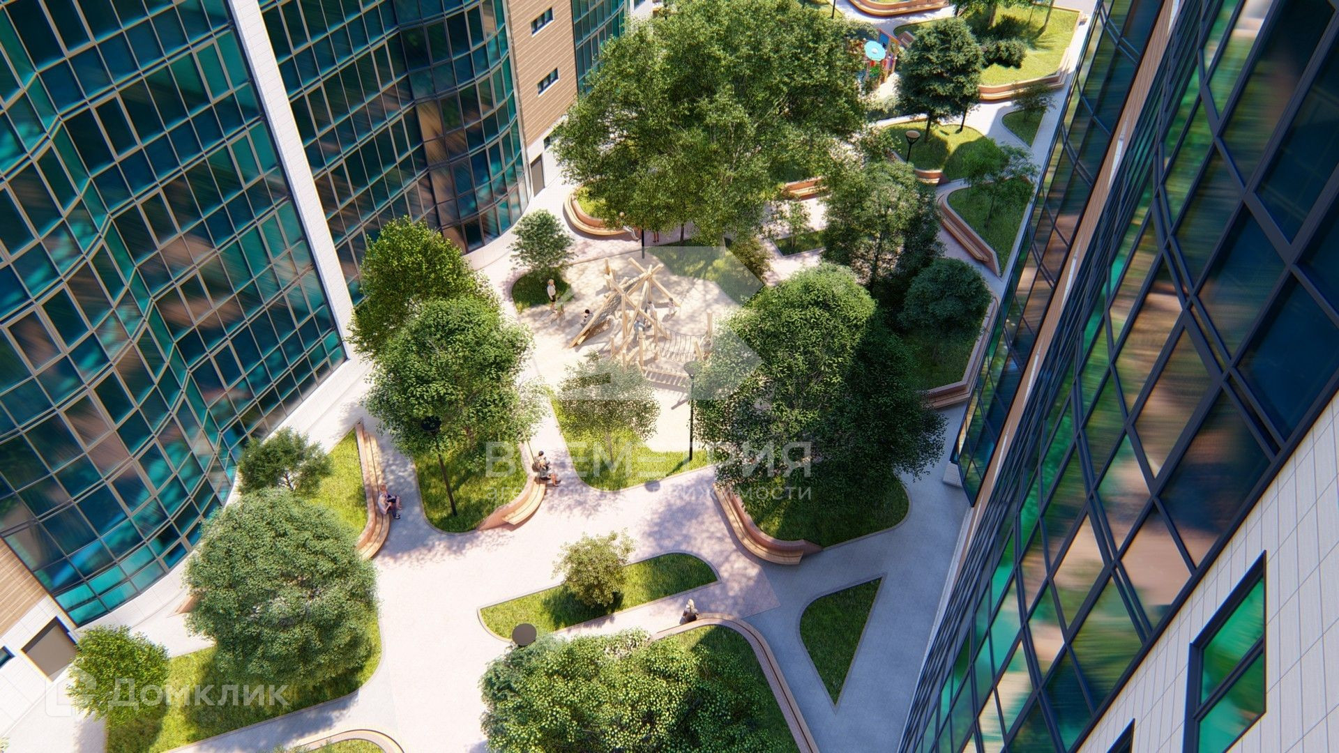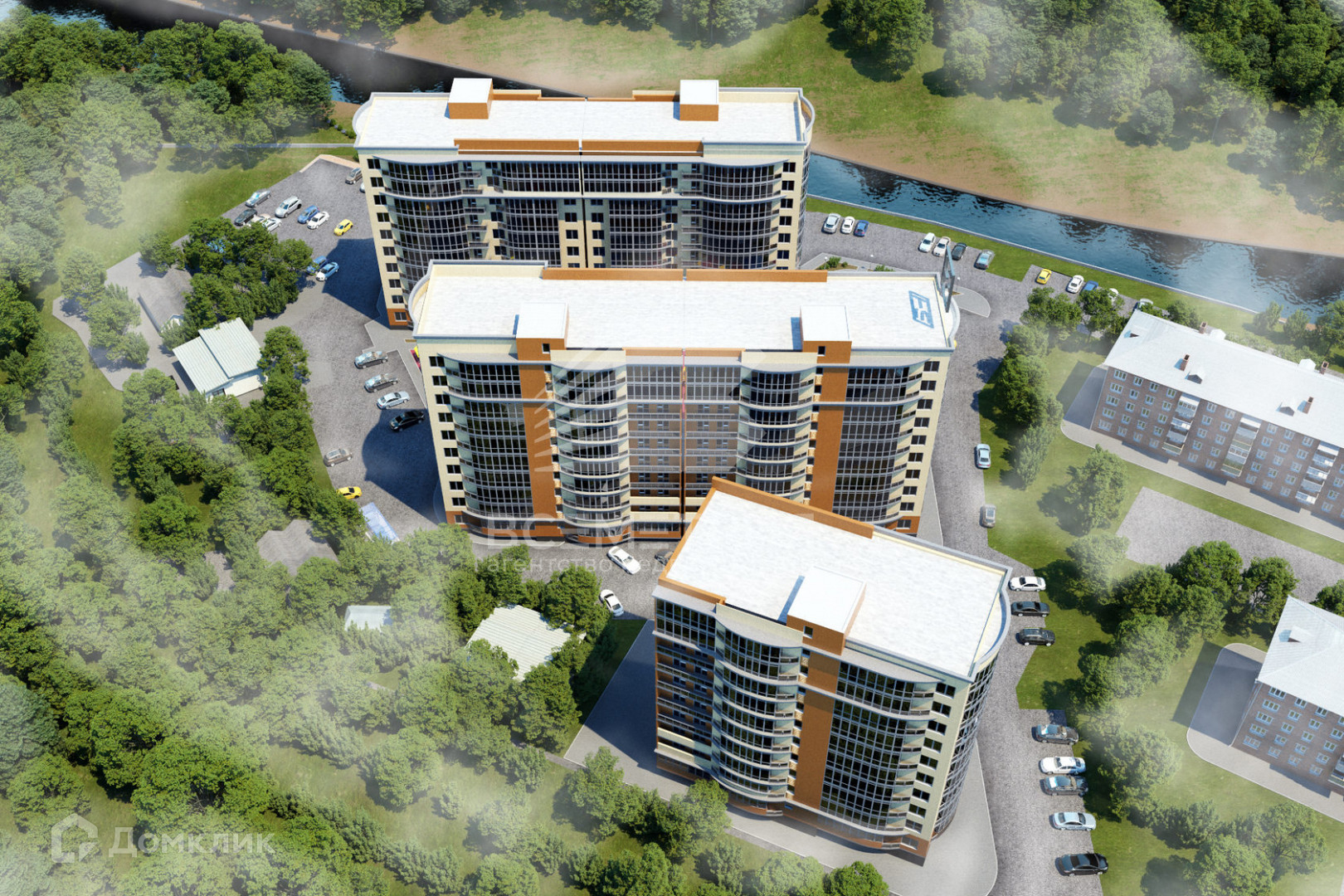 Территория комплекса полностью благоустроена, спроектированы: собственный бассейн и водные круглогодичные зоны, теннисный корт, беседки для барбекю, фонтан, зеленые эко-зоны и прогулочные аллеи. Во дворах установлены современные детские и спортивные площадки, вдоль реки возведена собственная набережная. На придомовой территории находится детский сад и школа. На первых этажах расположены коммерческие помещения. Для автовладельцев предусмотрен подземный паркинг.