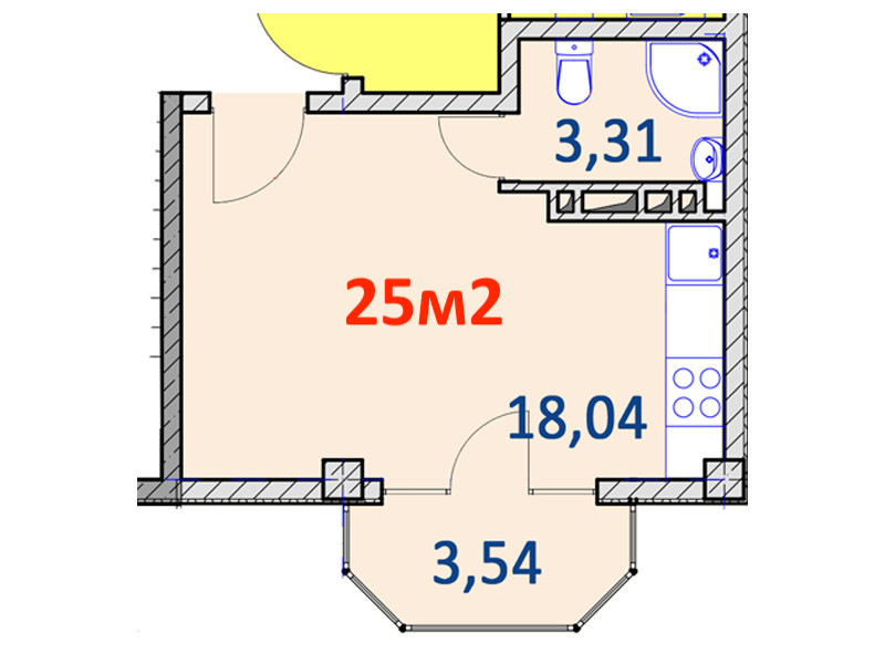 Площадь квартиры 25 кв.м.