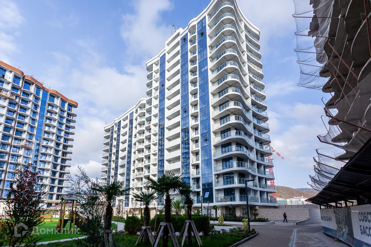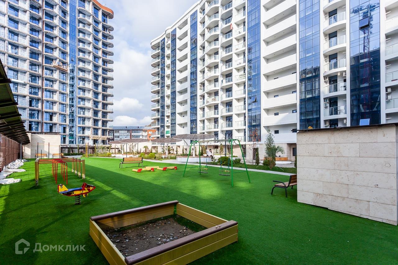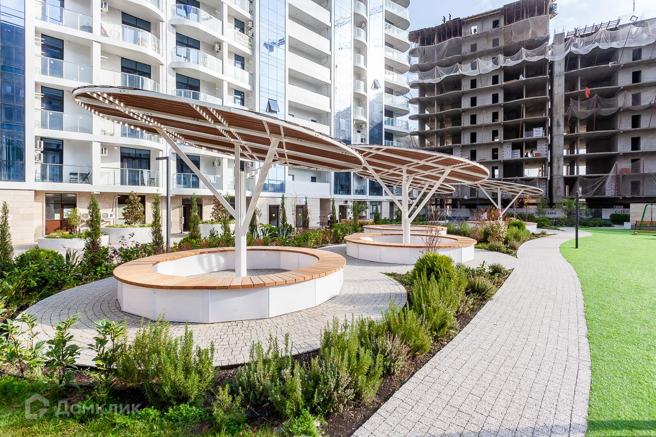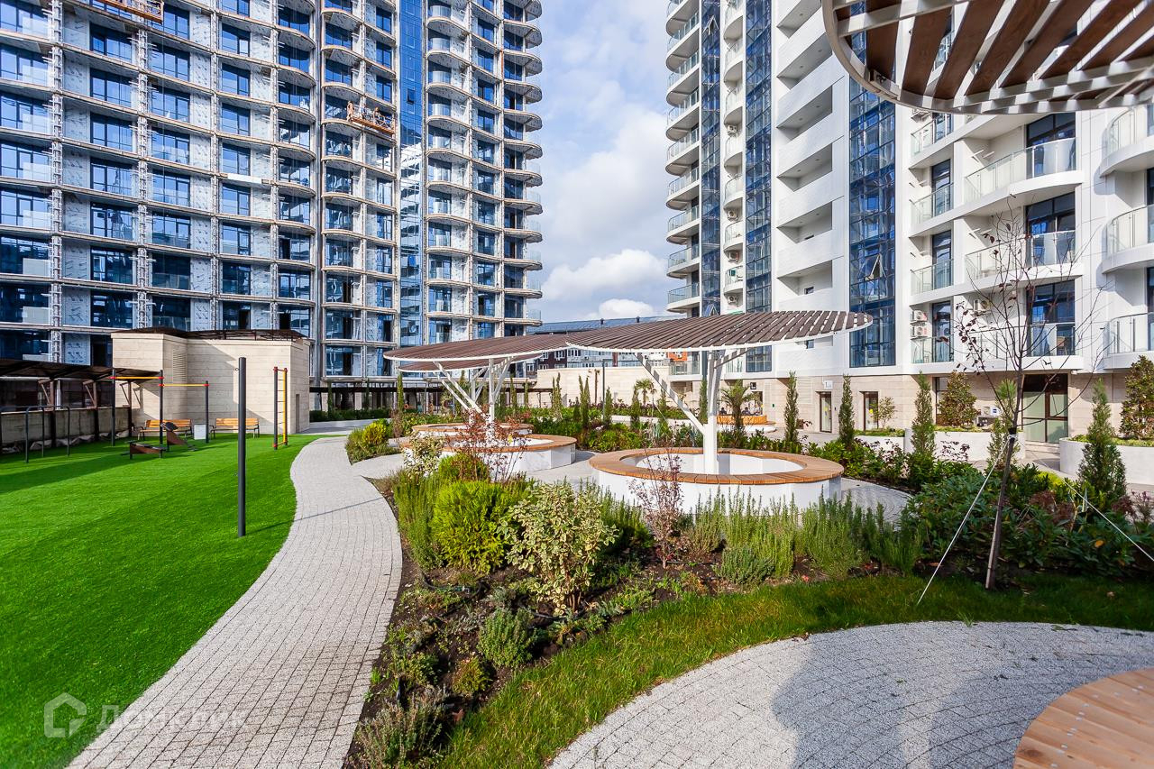 Комплекс бизнес-класса с бассейнами, аквапарком и современными детскими площадками. До моря 1 км по ровной аллее вдоль реки.