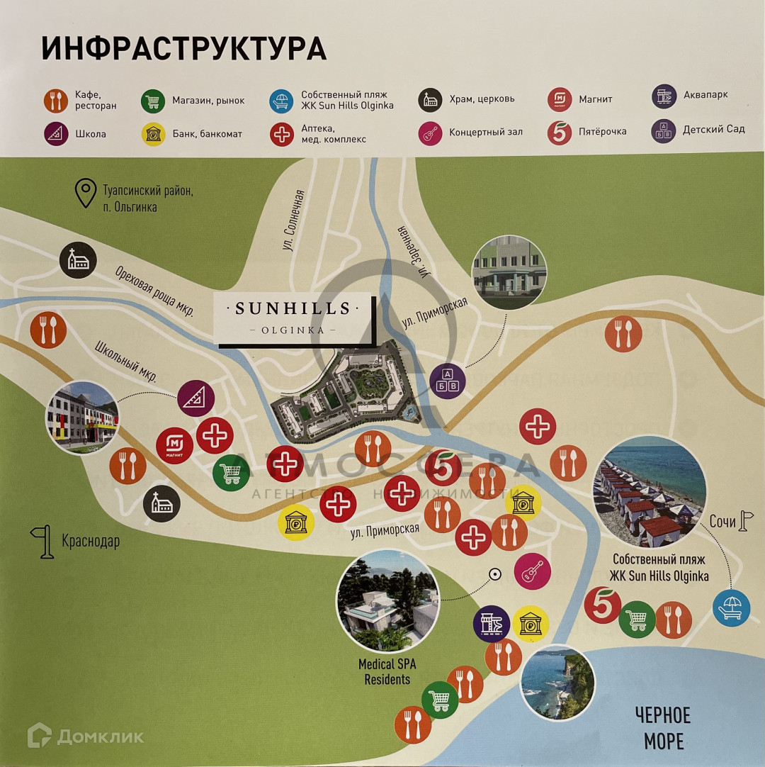 Инфраструктура с Ольгинка развита есть все необходимое для жизни и сезонного отдыха: школа, детский сад, дом культуры, магазины, аптеки и т.д. Работают круглогодичные пансионаты с массой услуг и развлечений.