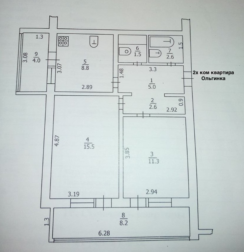 Комнаты изолированные 11 и 15 кв.м., кухня 9 кв.м., санузел совмещенный, две лоджии 8 и 4 кв.м.