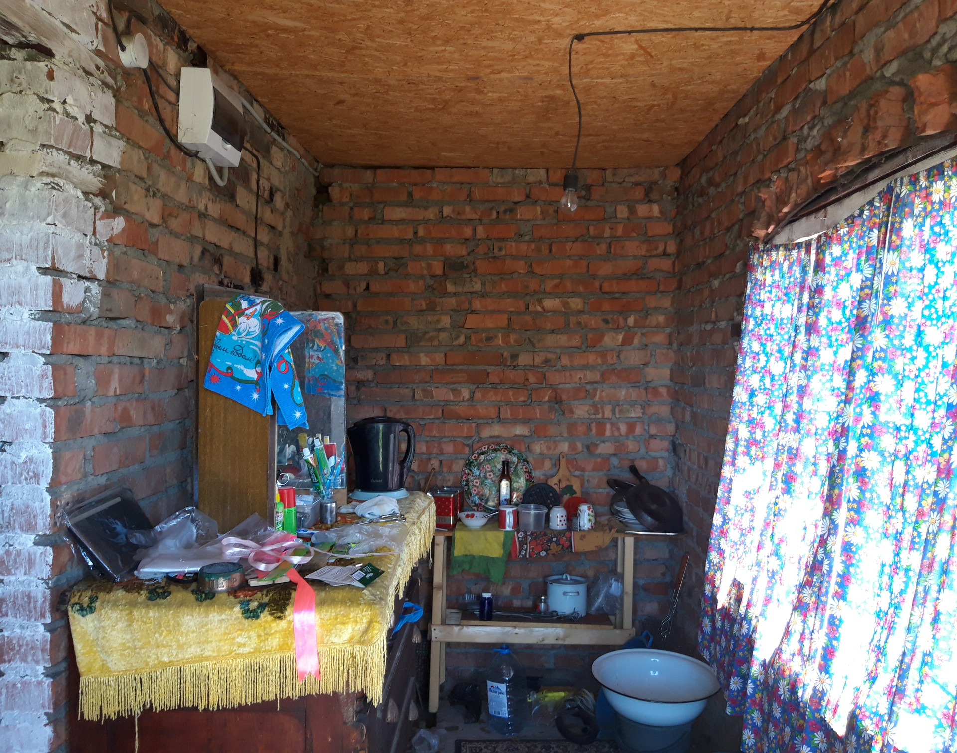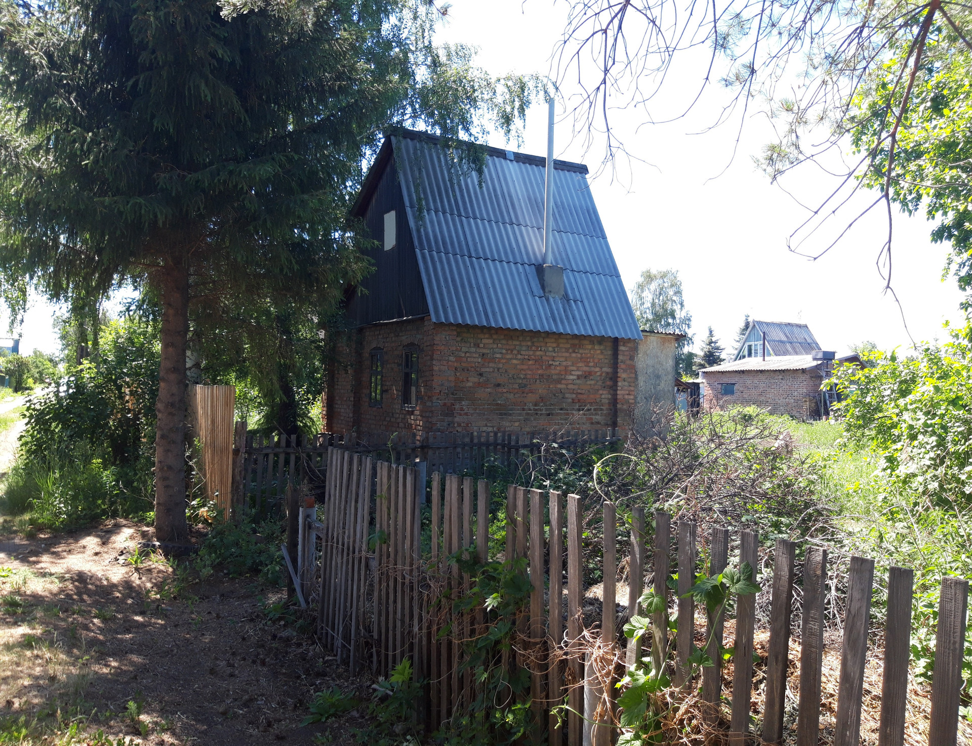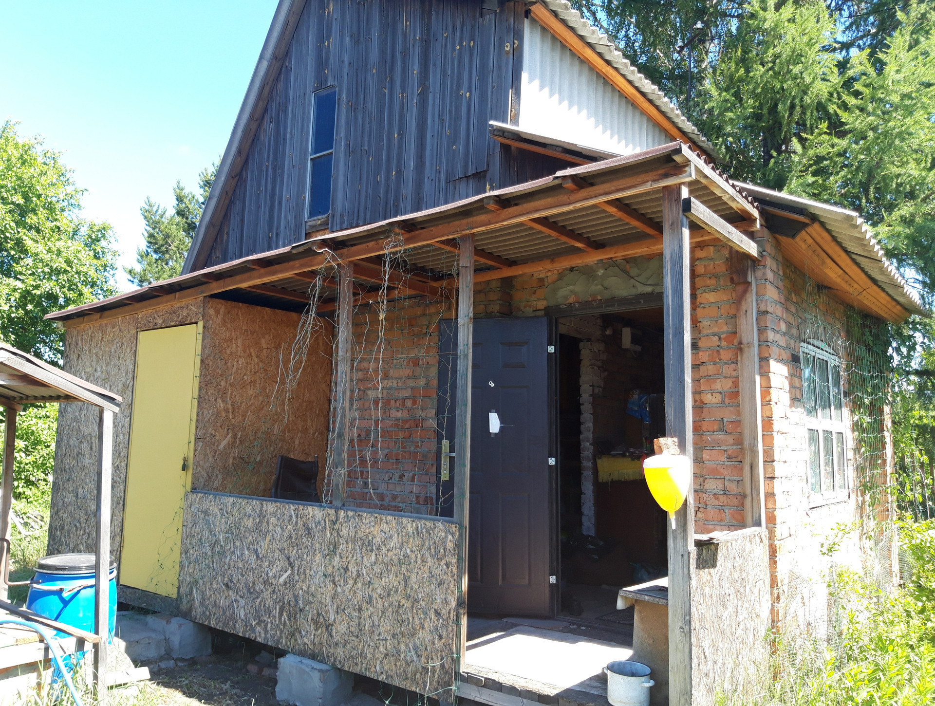 Дом 40м2 2х этажный + 5м2 хоз помещение и крыльцо (1 этаж: кухня и комната, открытая верандочка и отдельное место для инвентаря, на 2 этаже одна комната) для летнего проживания, но можно утеплить для зимнего проживания и оформить прописку, что и сделали соседи рядом. Для полива оборудован колодец глубиной 10м, насос и шланги.