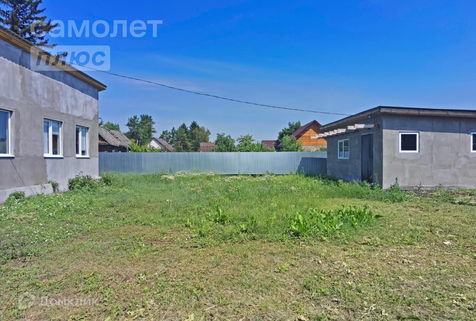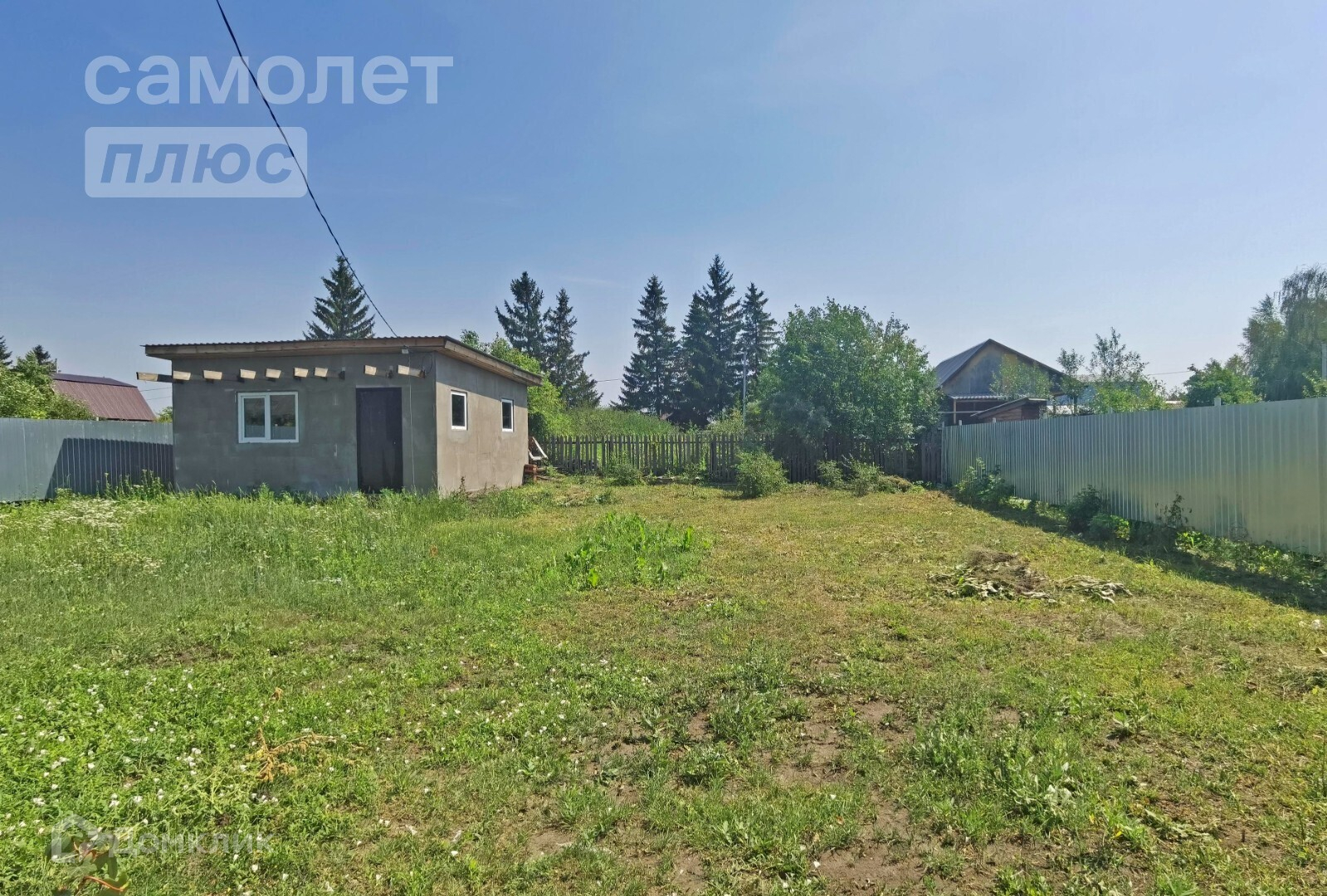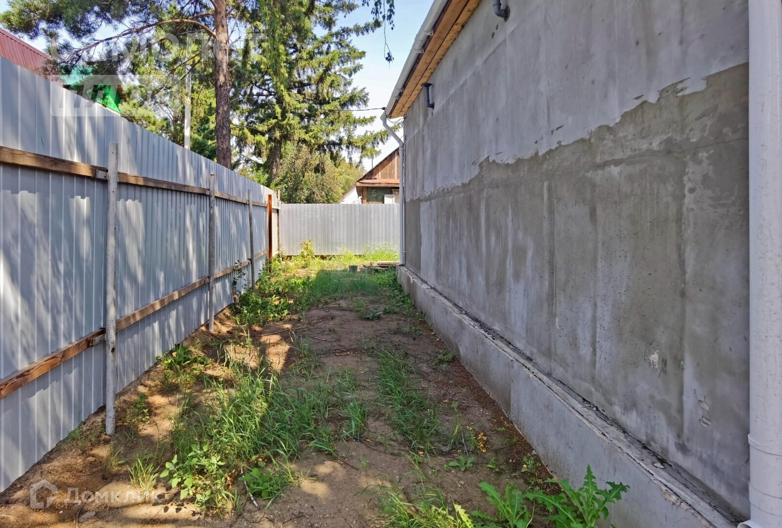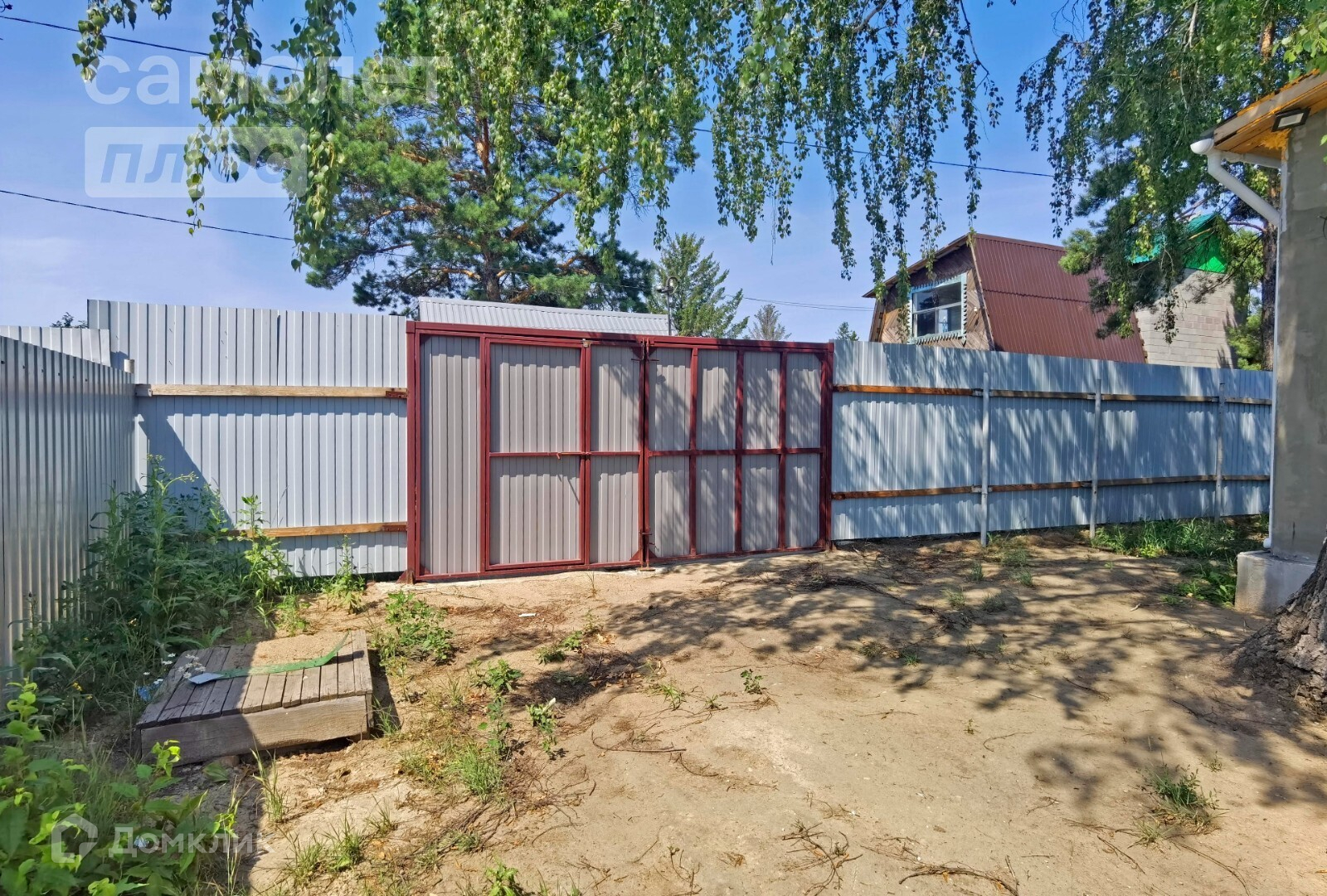 Территория участка с трёх сторон огорожена забором из профлиста, с одной стороны забор деревянный.