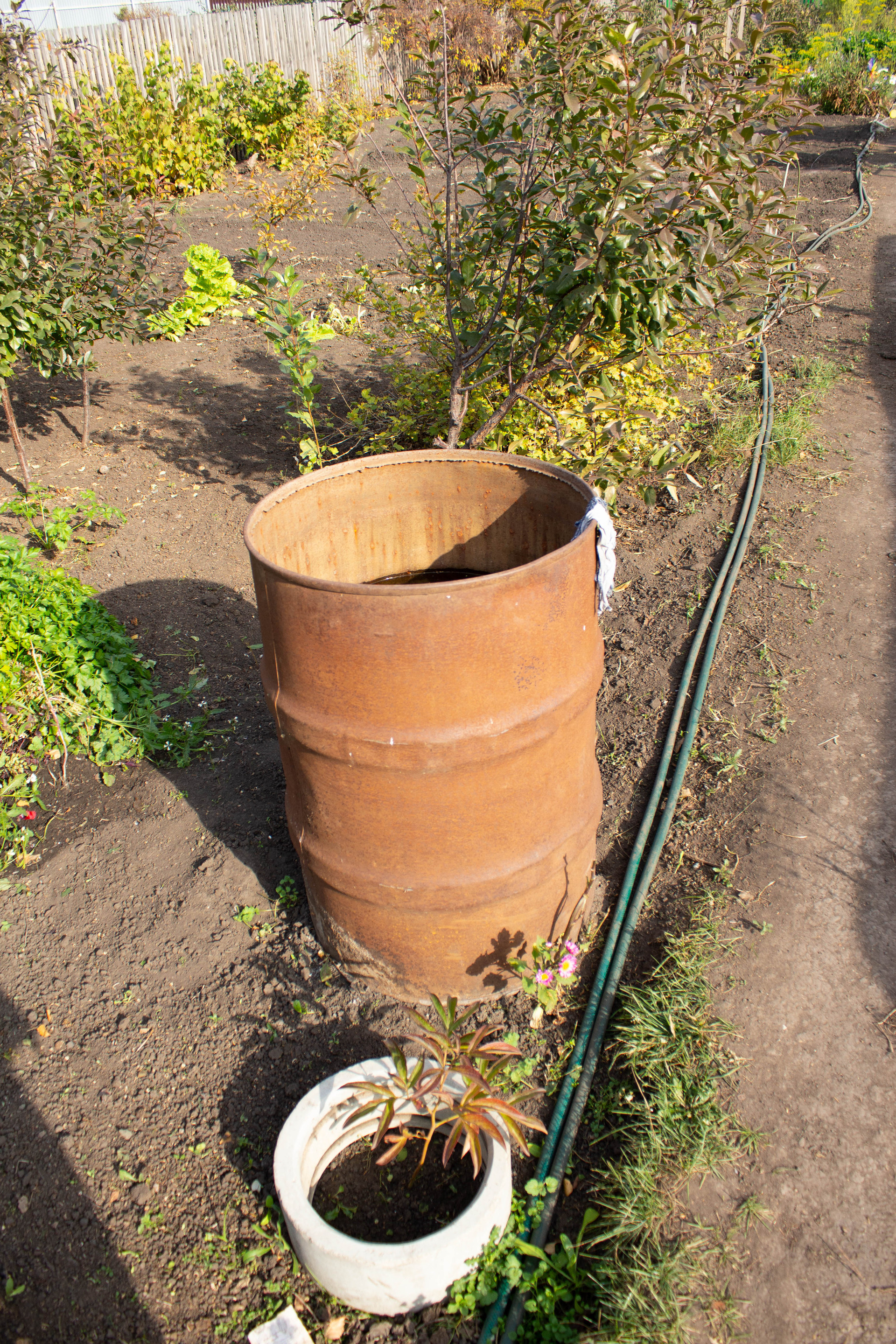 Много бочек. Емкость для воды - вкопанная в землю.