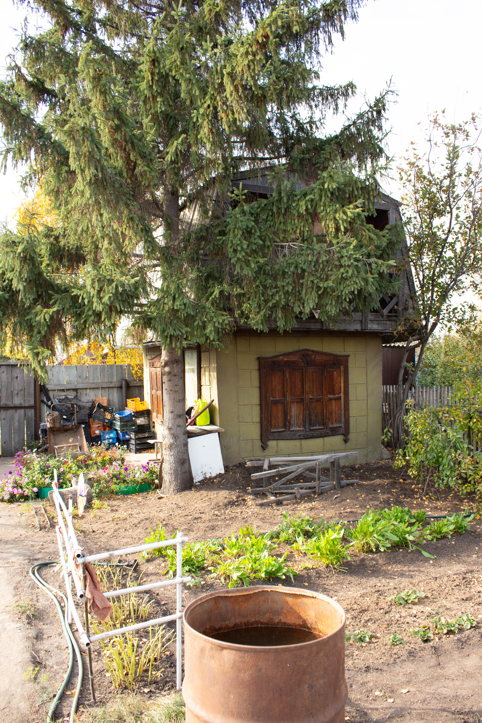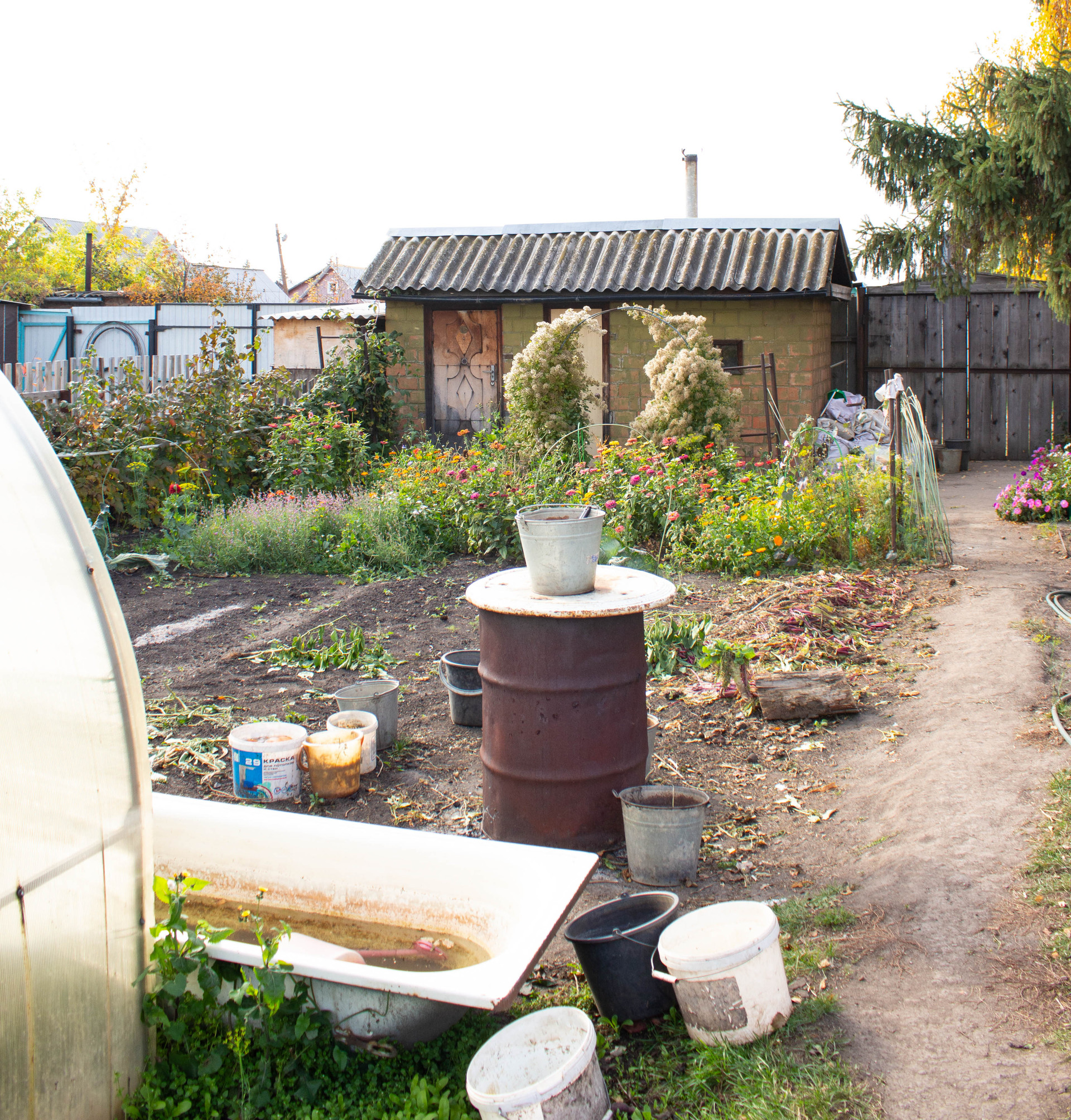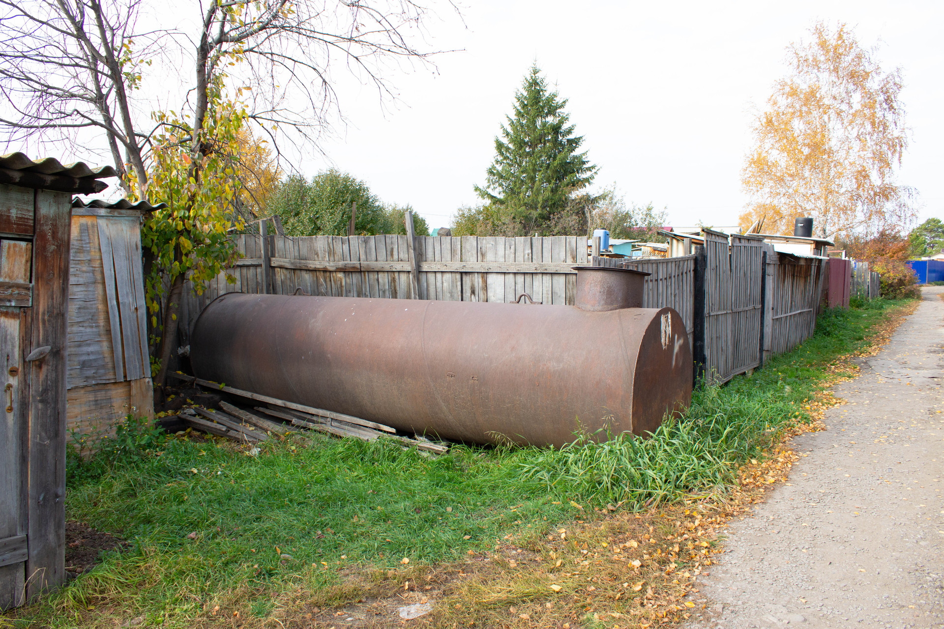 За забором огромная емкость-бочка для воды.