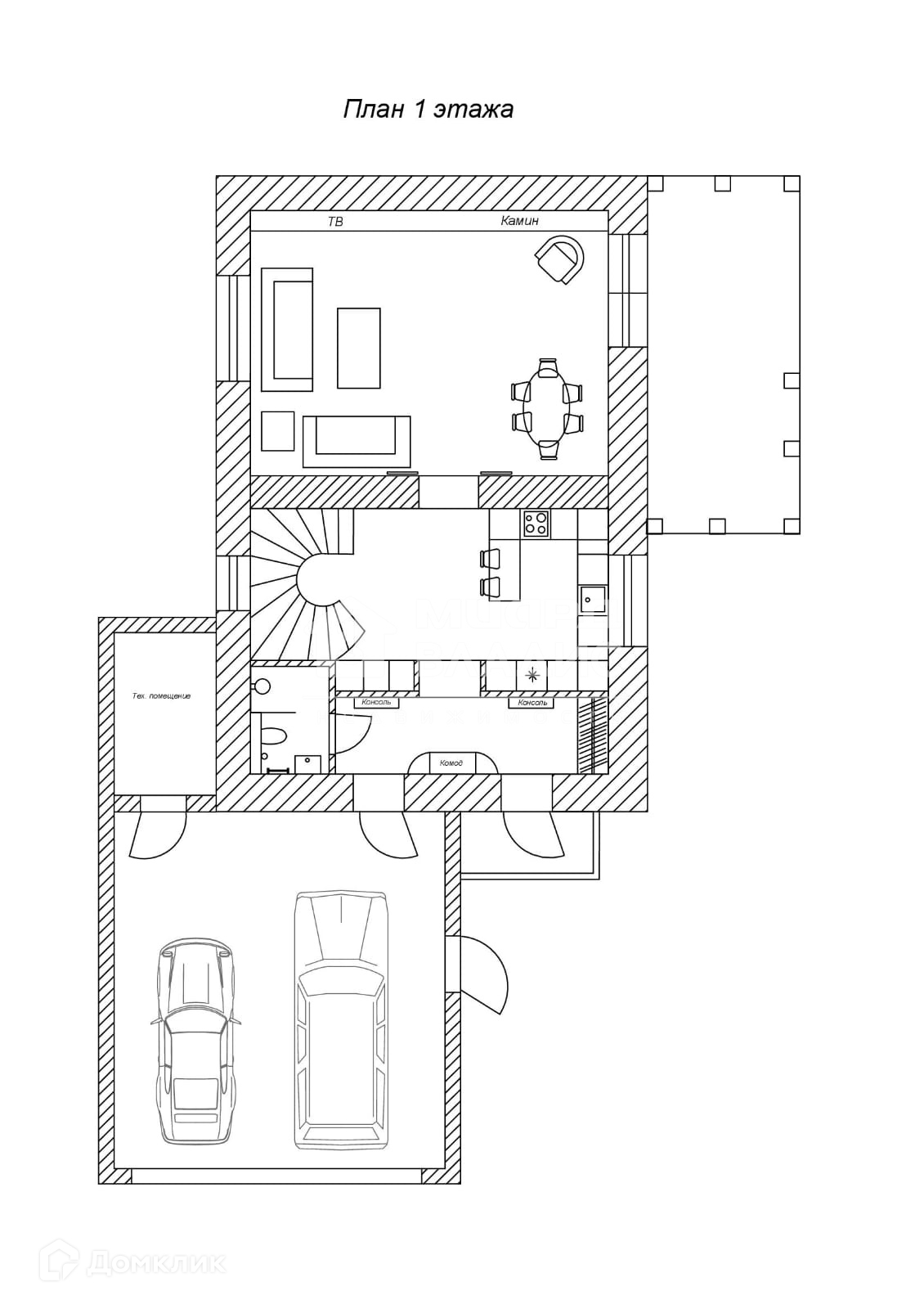 Первый этаж предполагает размещение гостиной с камином, кухни, гостевого санузла и вместительной прихожей с отсеками для хранения личных вещей, выход в гараж, рассчитанный на два автомобиля.