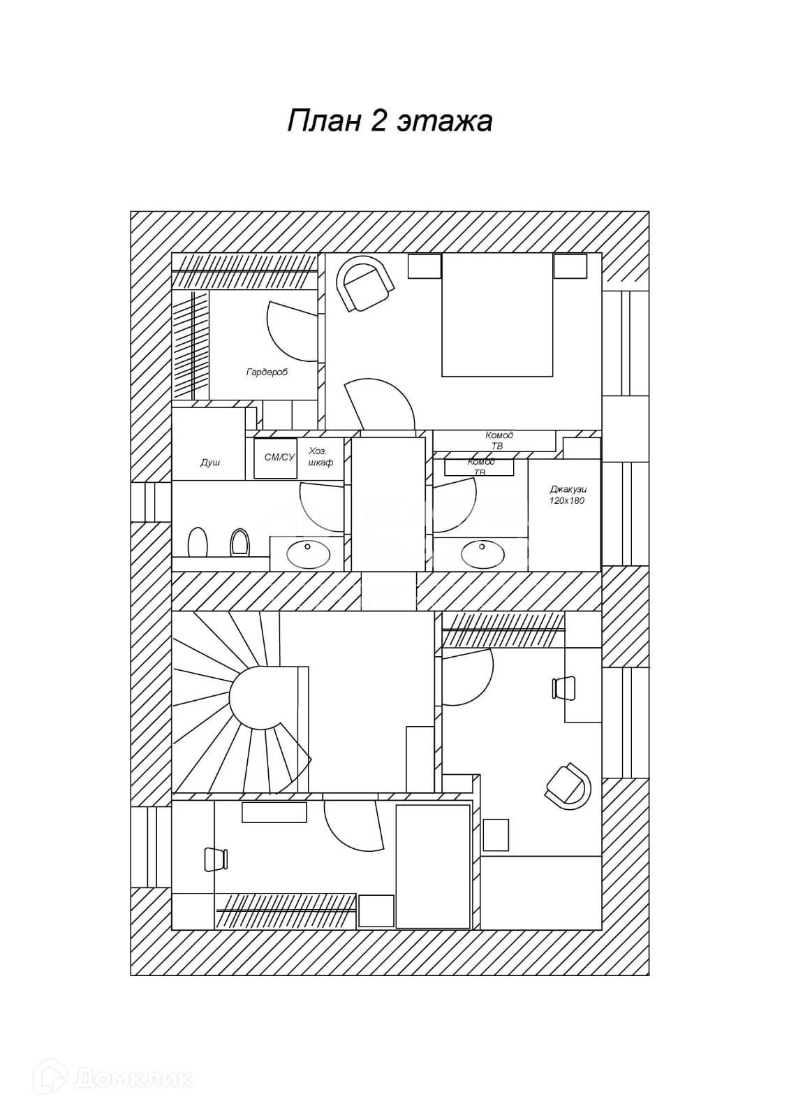 Второй этаж предполагает размещение одной родительской и двух детских спален с 2-я санузлами.
